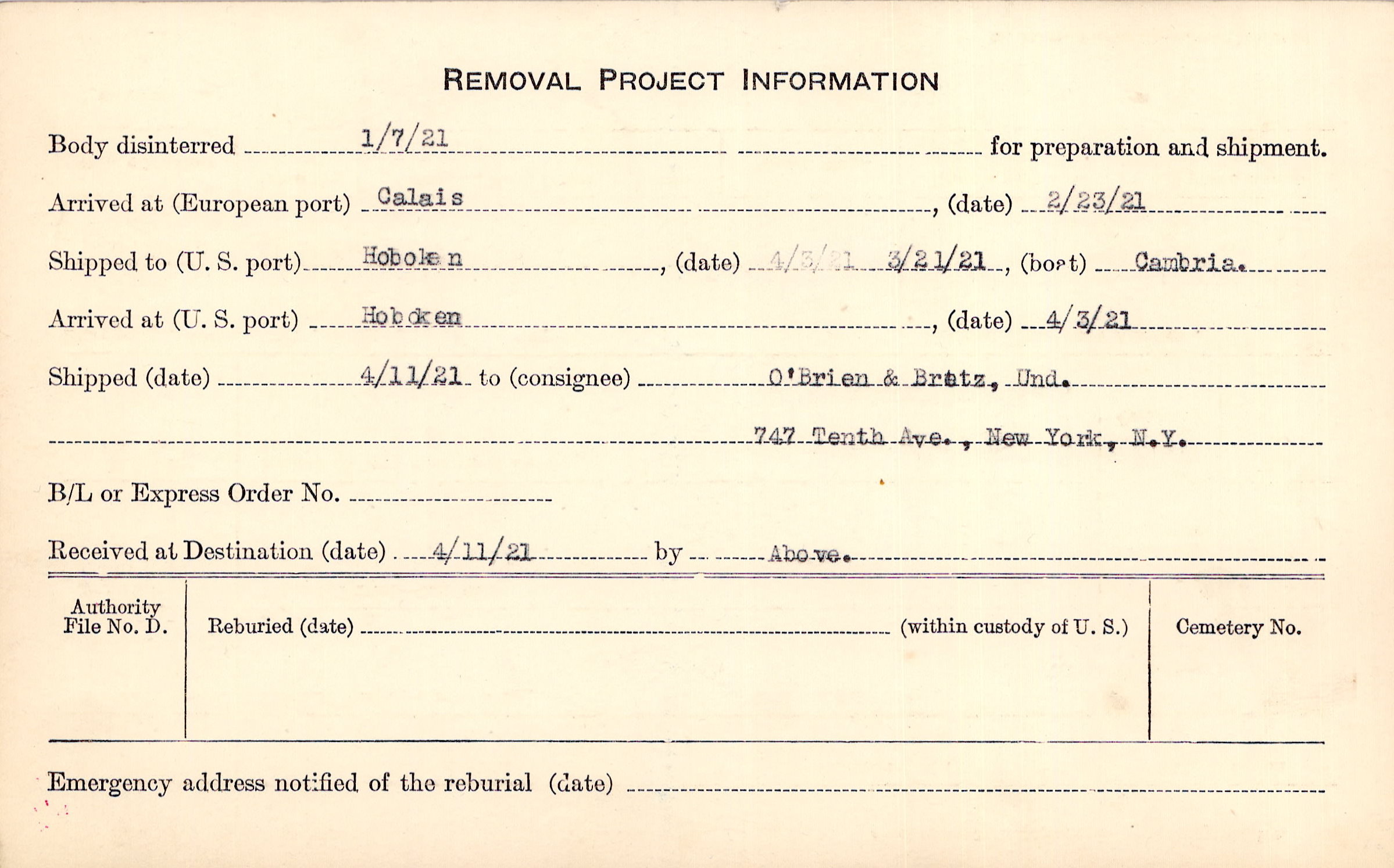 Body disinterred 1/7/1921 for preparation and shipment.