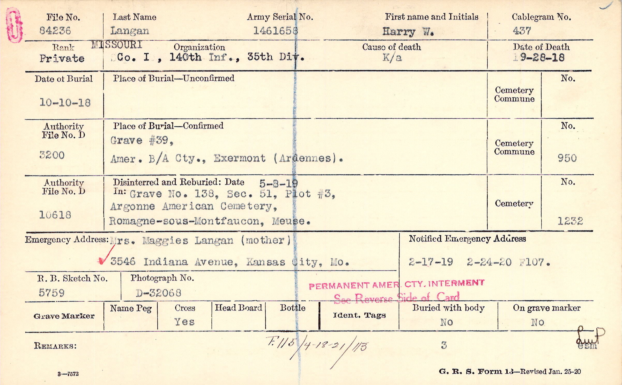 Mrs. Maggies Langan (mother), 3546 Indiana Avenue, Kansas City, Mo.