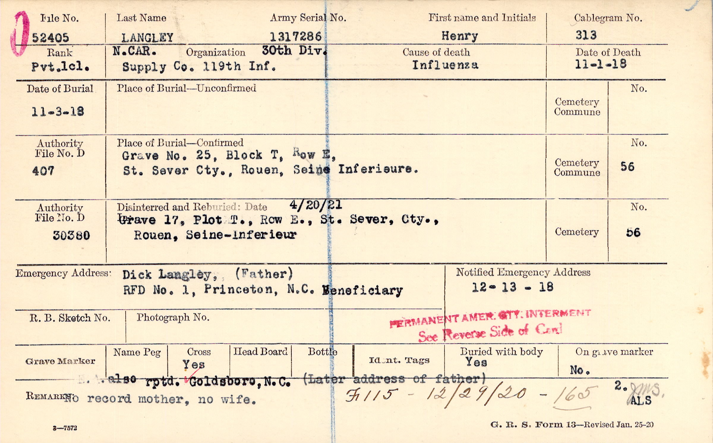 Grave 25, Block T, Row E, St. Sever Cty., Rouen, Seine Inferieure.