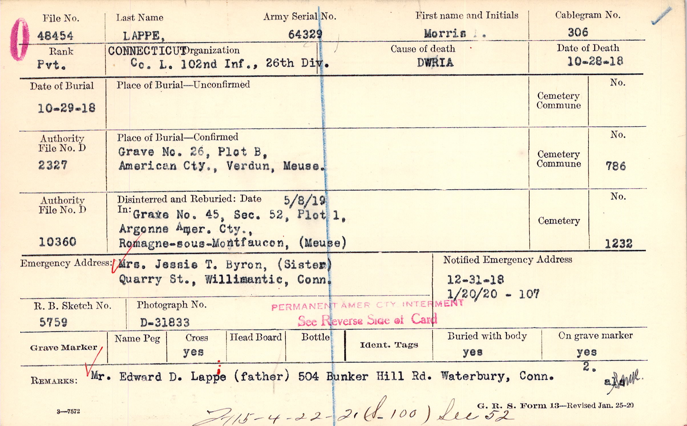 Mr. Edward D. Lappe,(father), 504 Bunker Hill Rd., Waterbury, Conn., F115 - 4-22-21 ( S 100) Sec 52