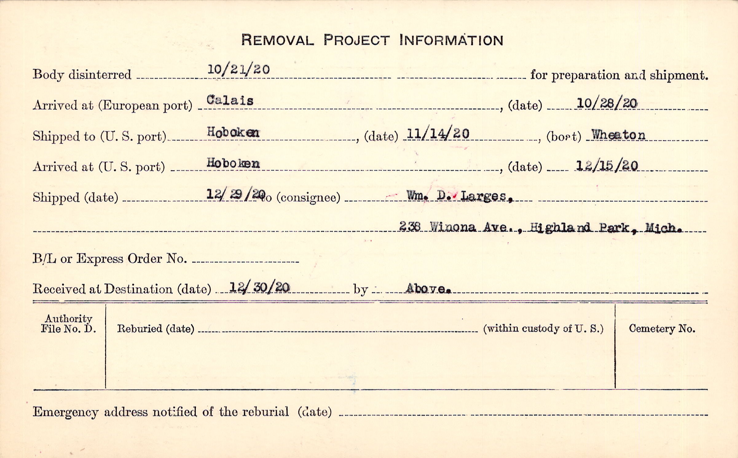 Body disinterred 10/21/1920 for preparation and shipment.