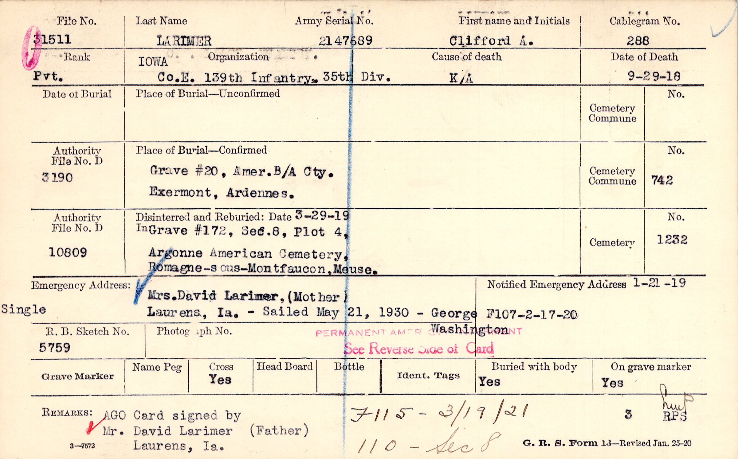 Grave #20, Amer. B/A Cty., Exermont, Ardennes