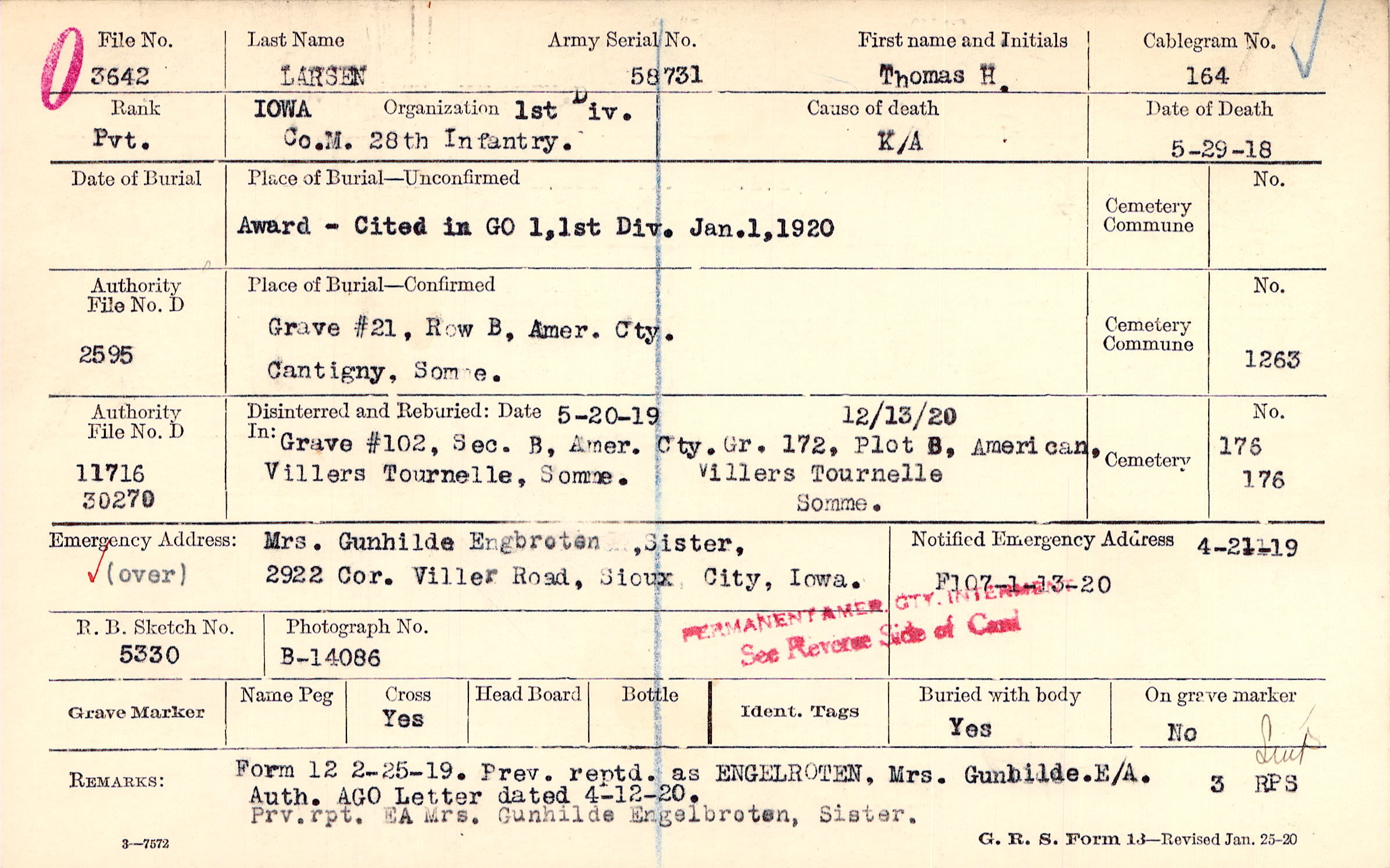 Grave #21, Row B, Amer. Cty., Cantigny, Somme.