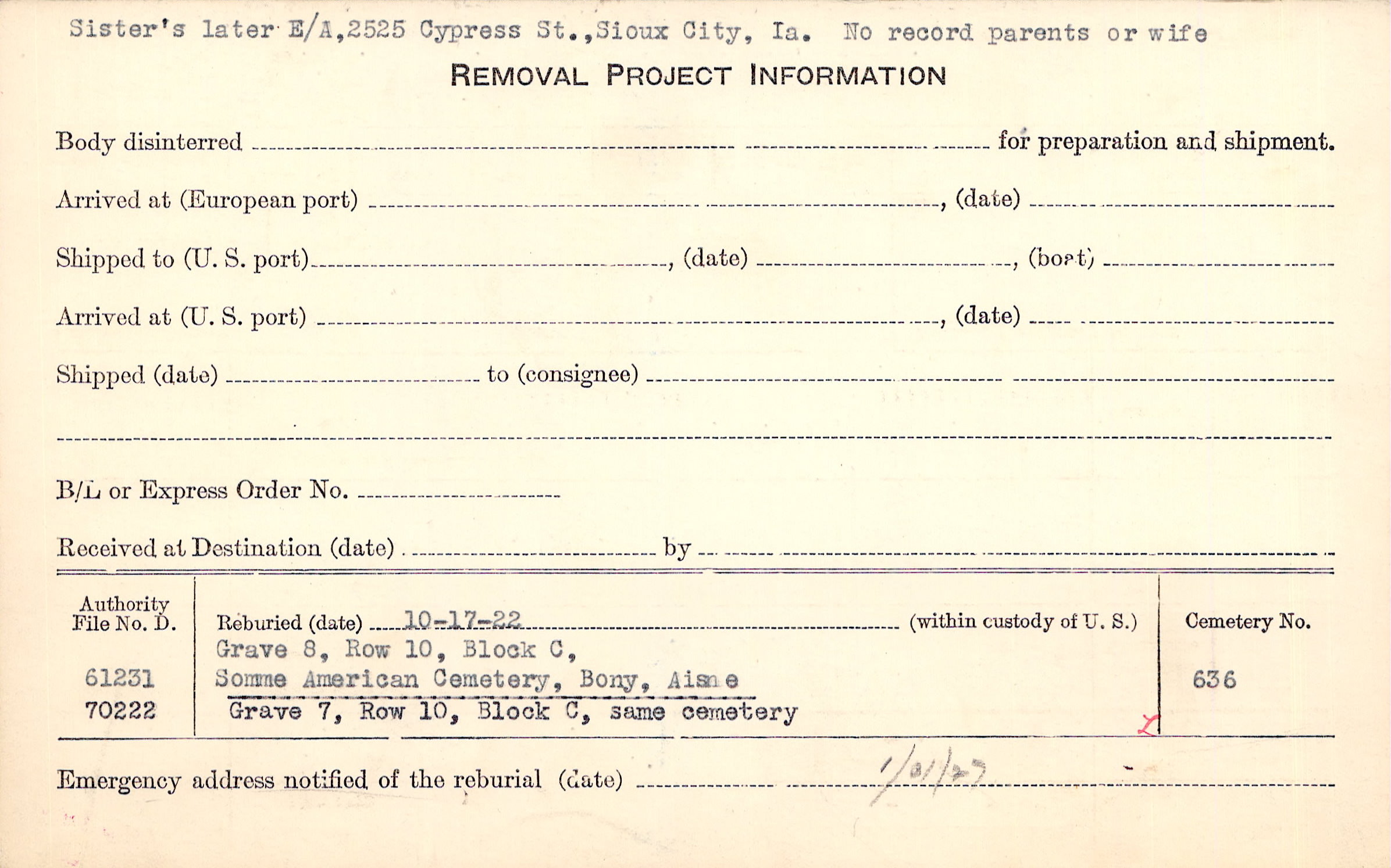 Sister's later E/A, 2525 Cypress St.,Sioux City, Ia. No record parents or wife |