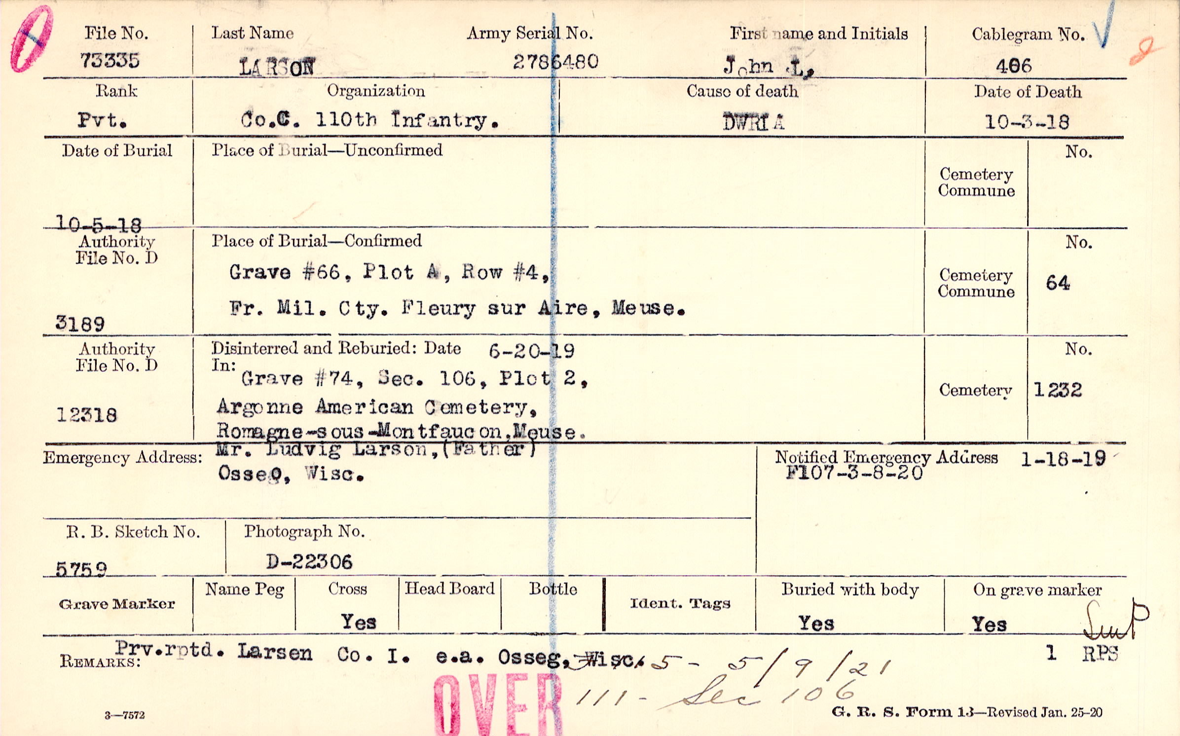 Grave 74, Section 106, Plot 2, Argonne American Cemetery, Romagne-sous-Montfaucon, Meuse