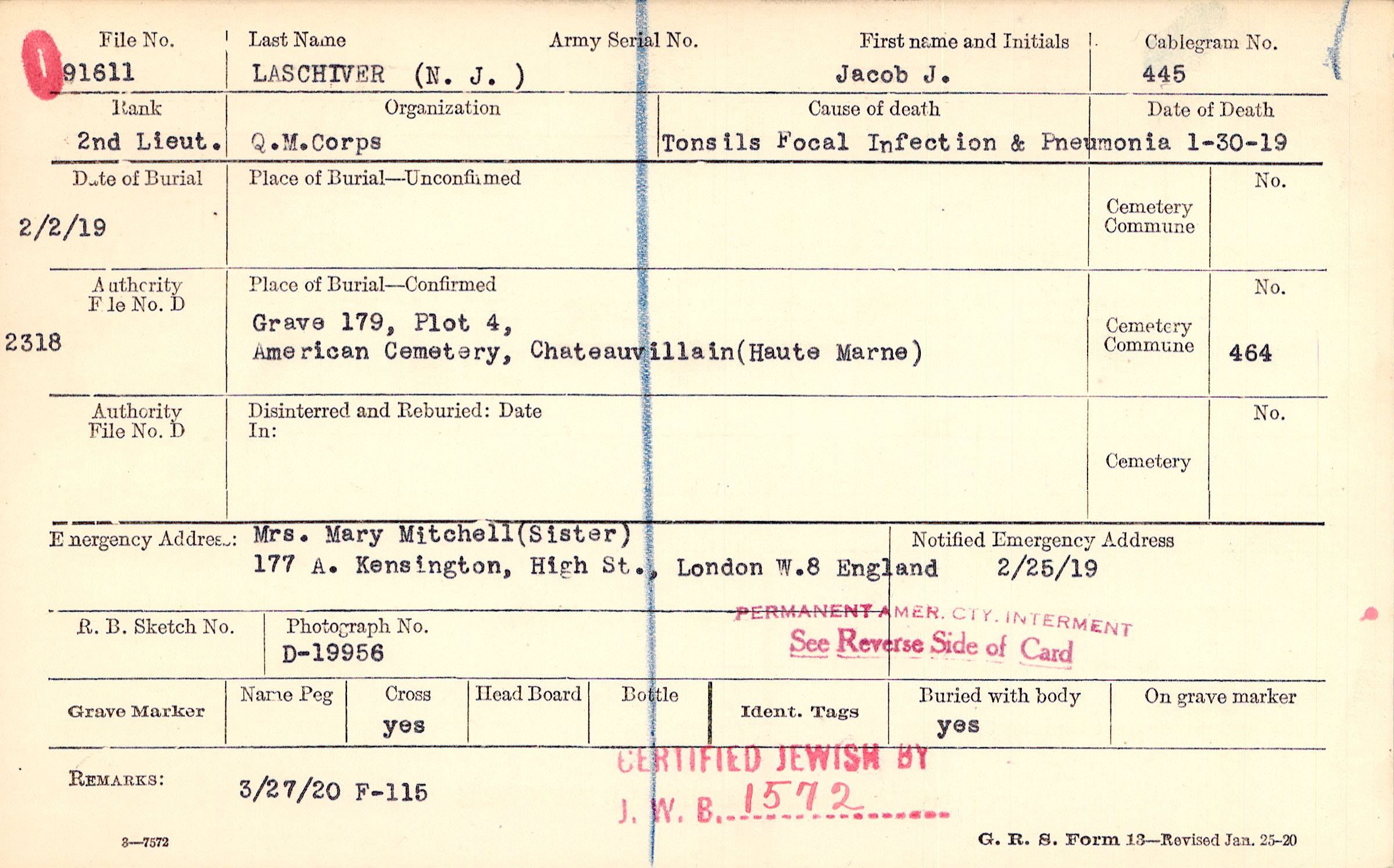 Grave 179, Plot 4, American Cemetery, Chateauvillain, Haute Marne.