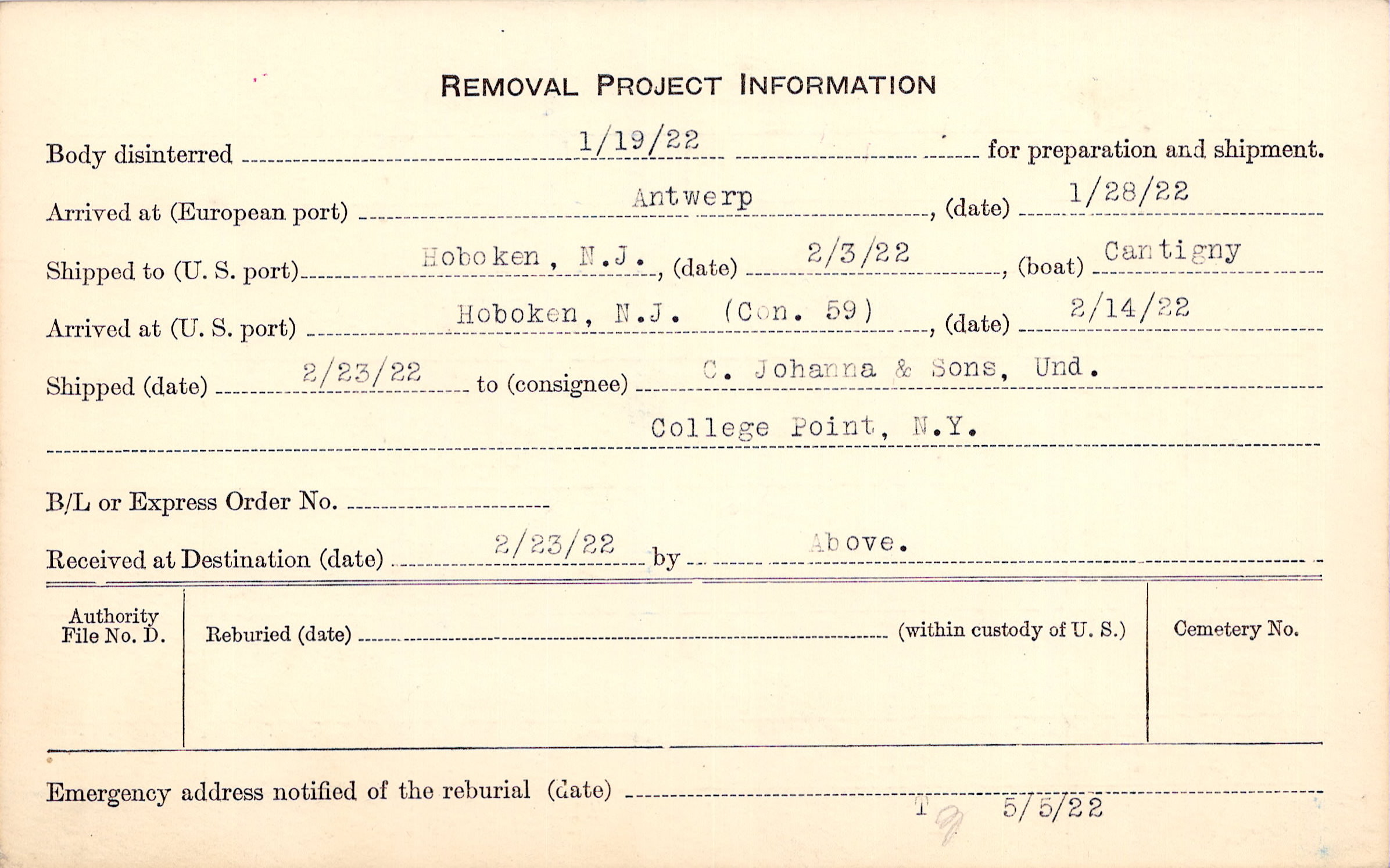 Body disinterred 1/19/1922 for preparation and shipment.
