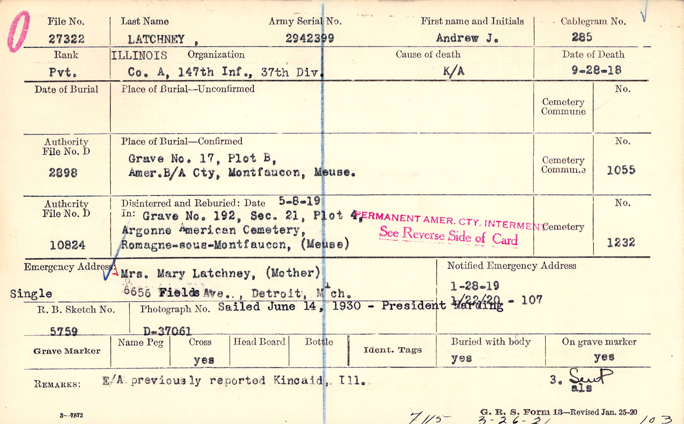 Grave 17, Plot B, Amer. B/A Cty, Montfaucon, Meuse.