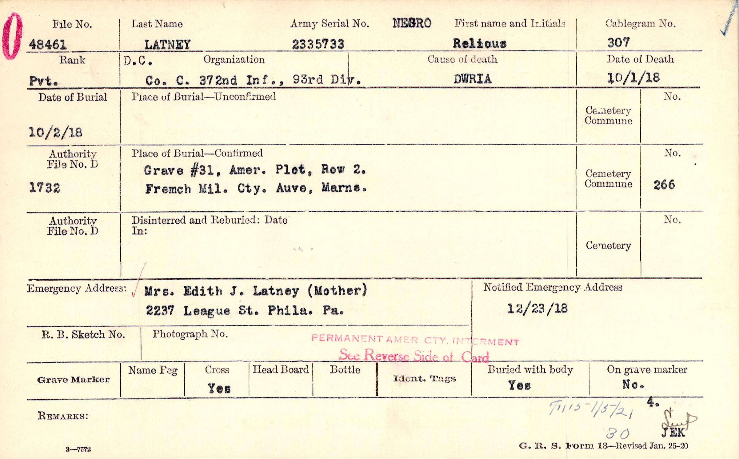 Mrs. Edith J. Latney (Mother), 2237 League St. Phila. Pa.