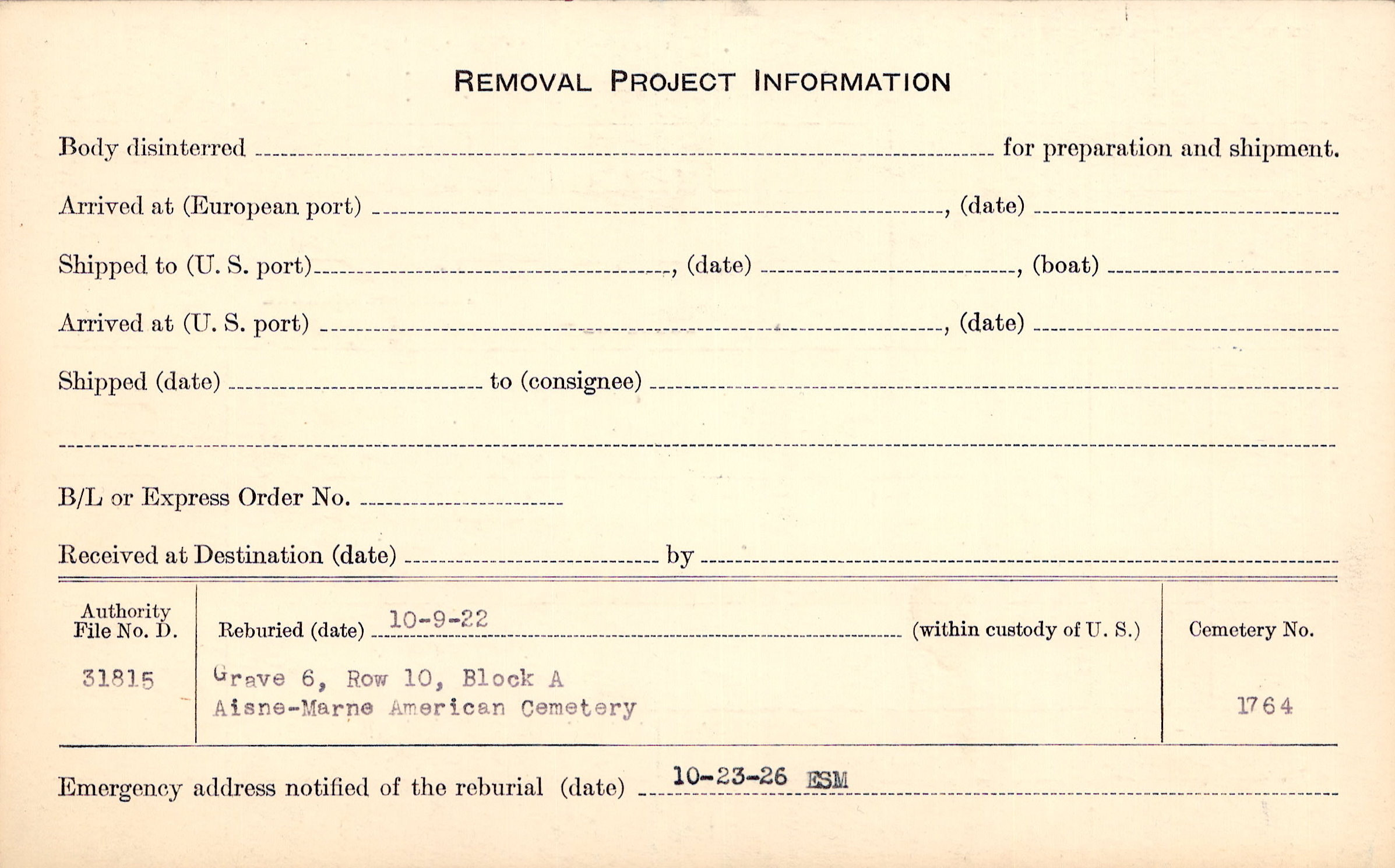 | Permanent Burial in Foreign Cemetery |