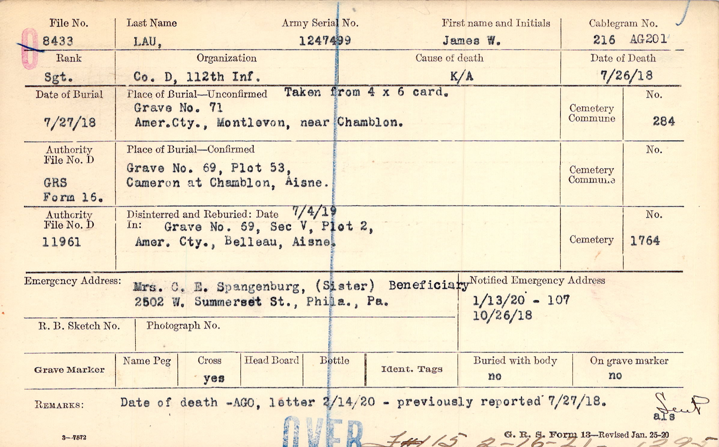 Grave 69, Section V, Plot 2, American Cemetery, Belleau, Aisne