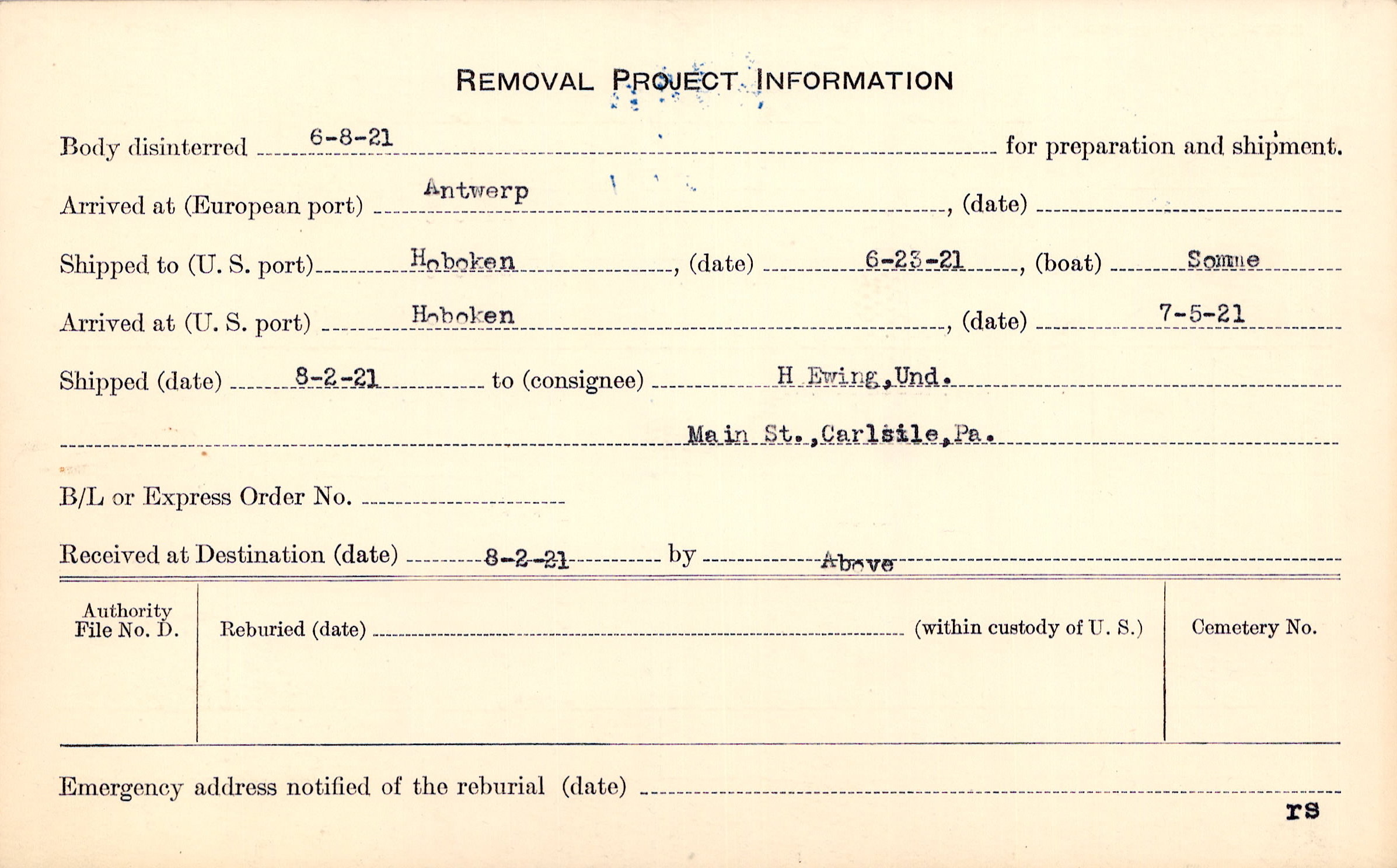 Body disinterred 6/8/1921 for preparation and shipment.