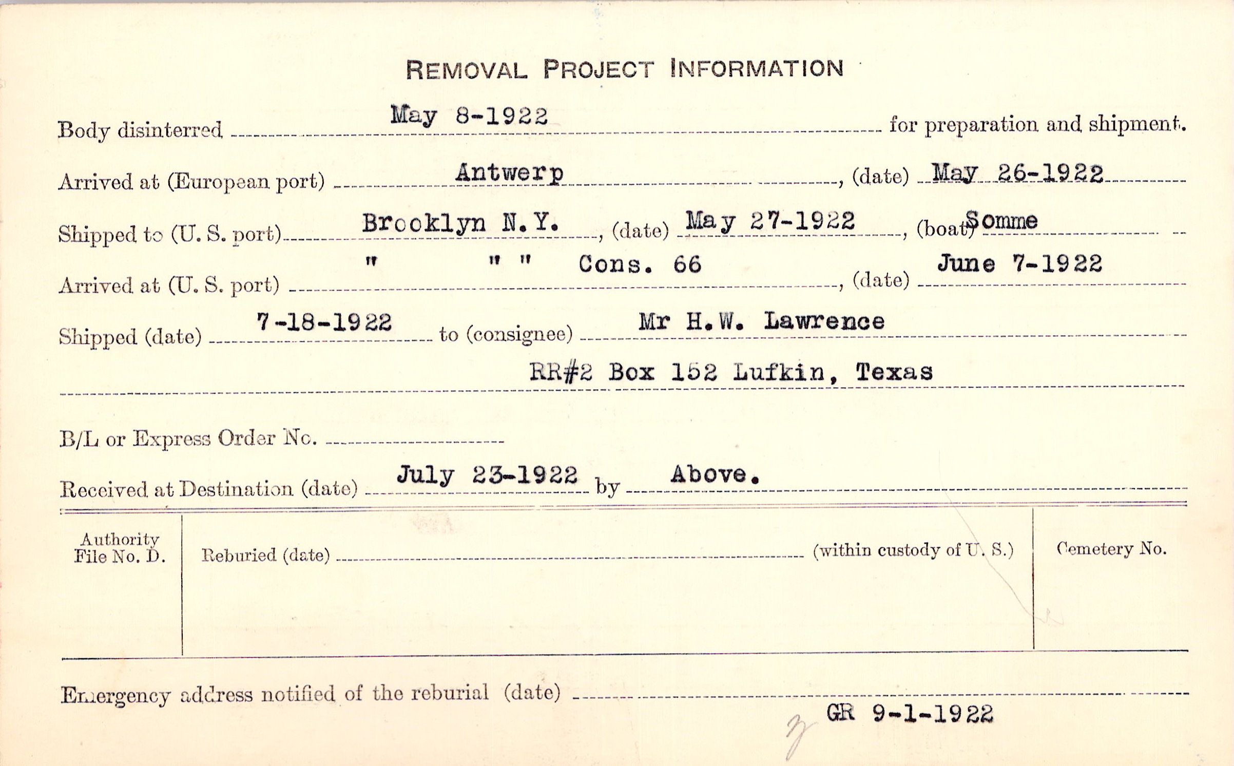 Body disinterred 5/8/1922 for preparation and shipment.
