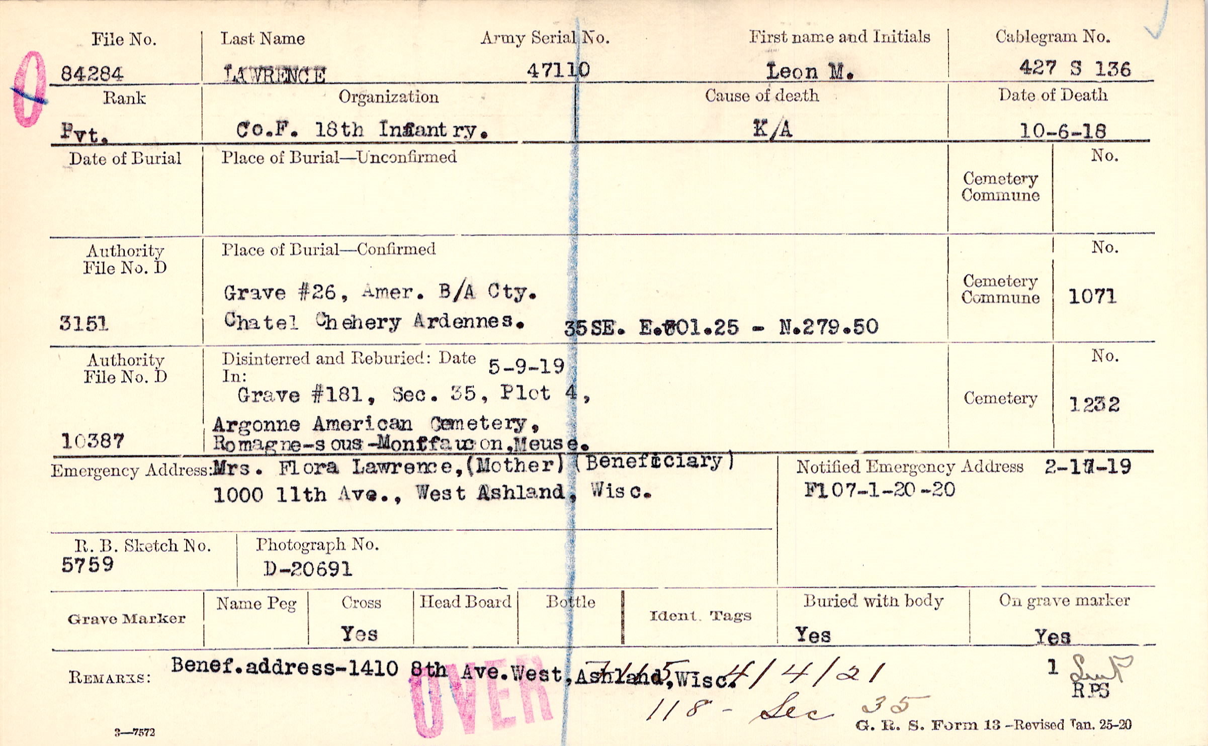 Mrs. Flora Lawrence, (Mother), 1000 11th Ave., West Ashland, Wisc., (Beneficiary)