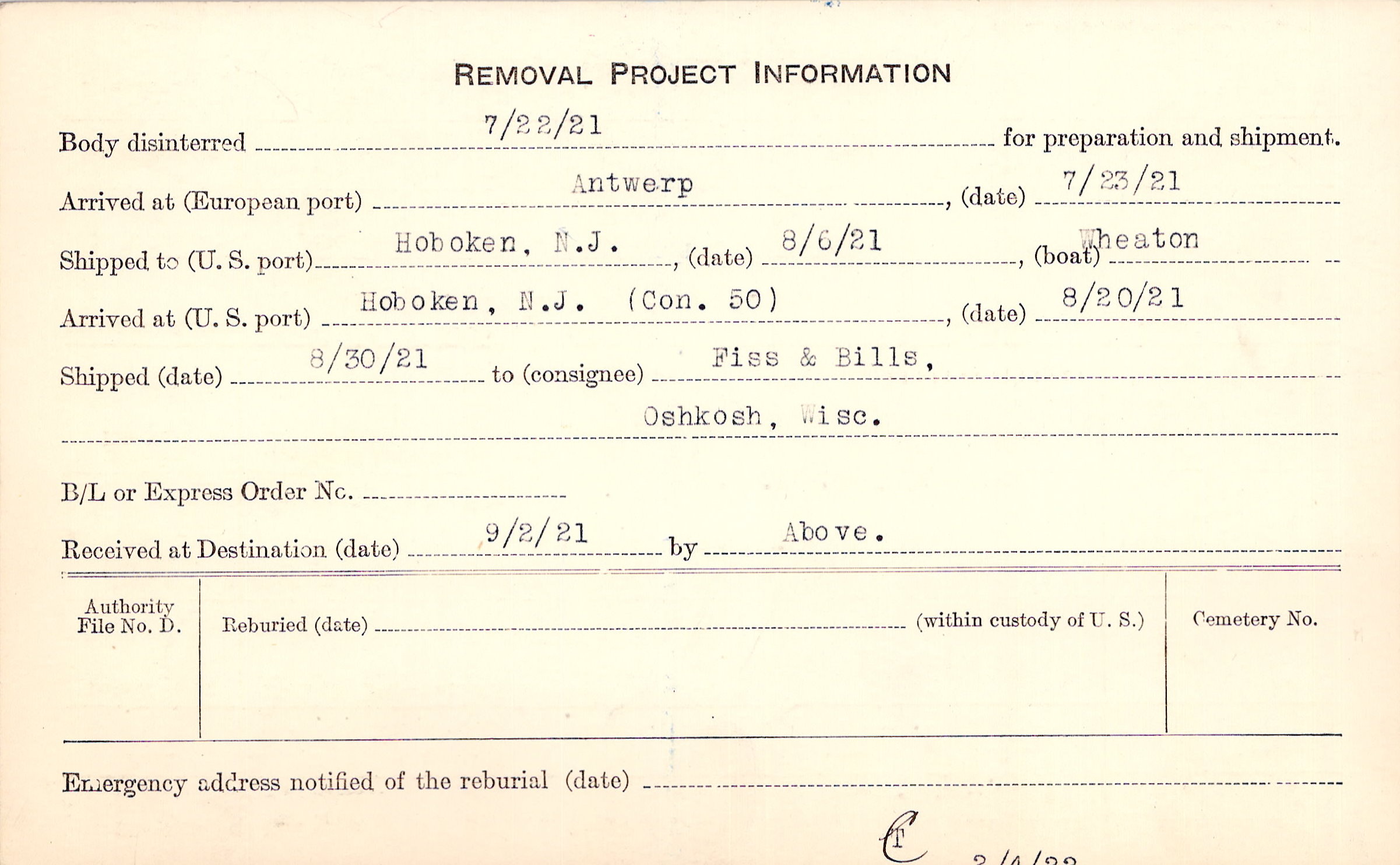 Body disinterred 7/22/1921 for preparation and shipment.