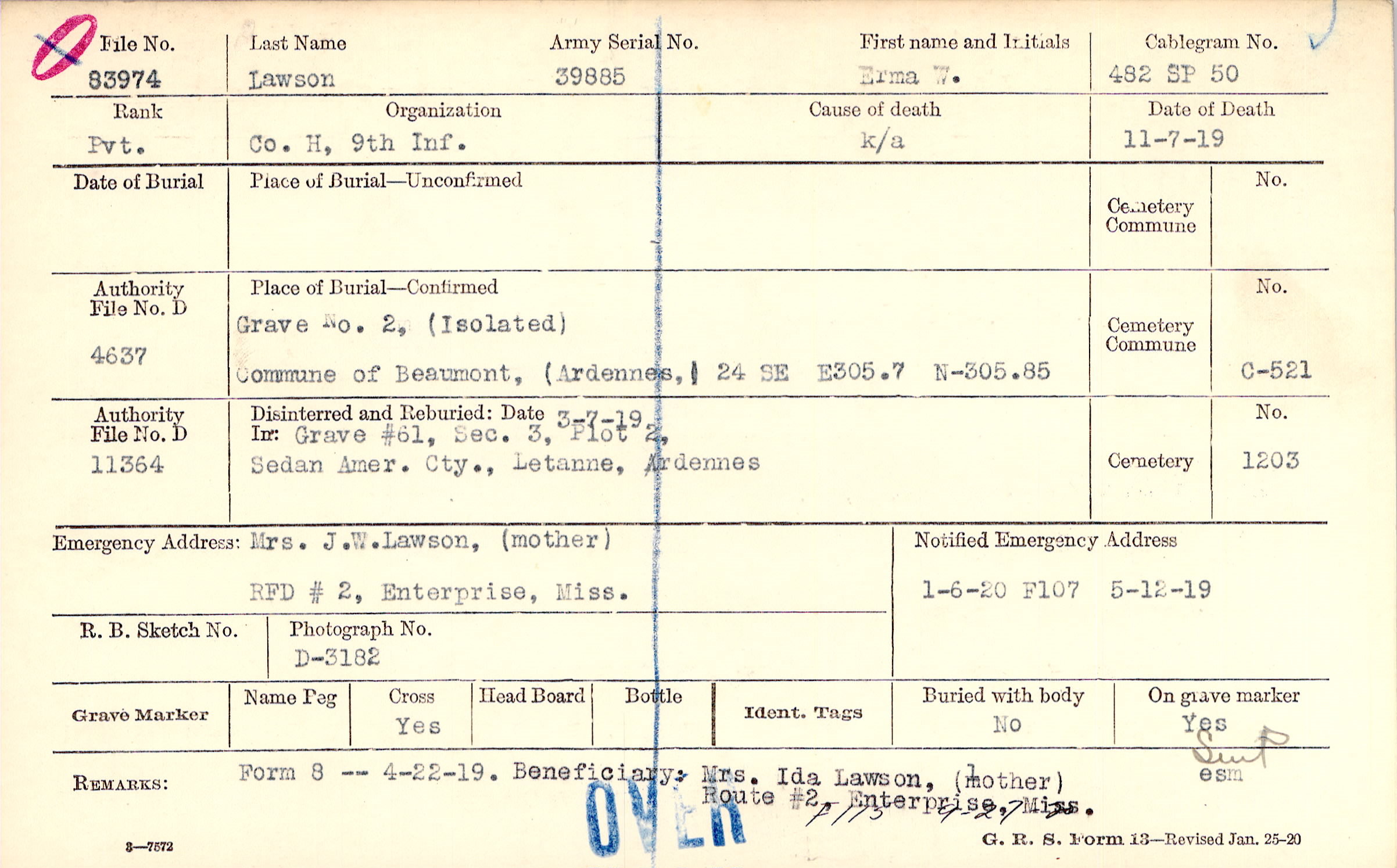 Beneficiary: Mrs. Ida Lawson, (mother) Route #2, Enterprise, Miss., Form 8 -- 4-22-19., F115 - 9-27-20