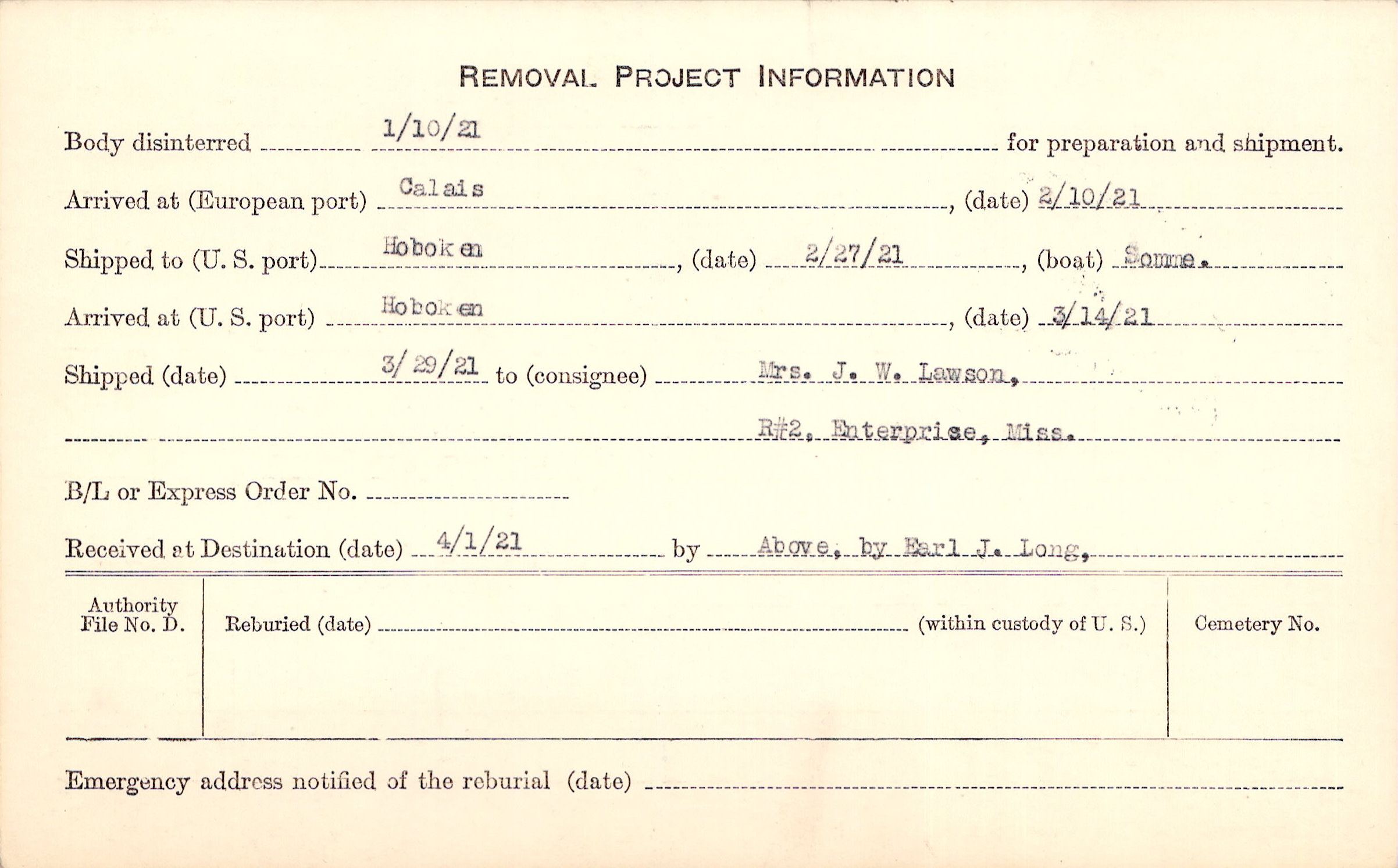 Mrs. J.W.Lawson, (mother), RFD # 2, Enterprise, Miss.
