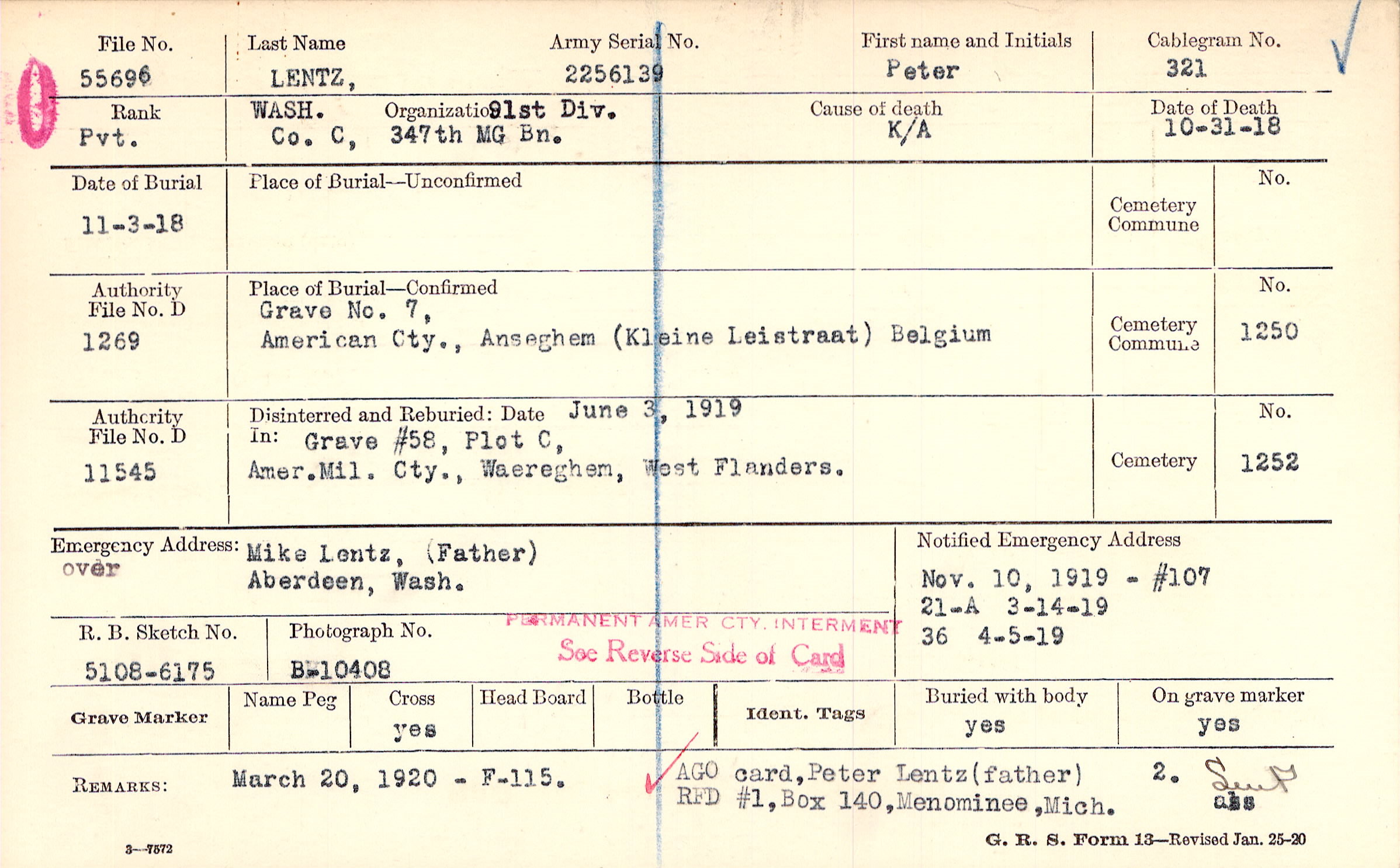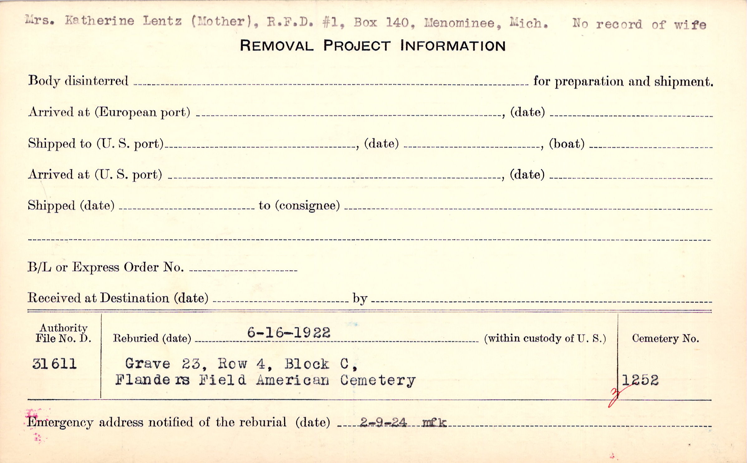 Mrs. Katherine Lentz, (Mother), R.F.D. #1, Box 140, Menominee, Mich., No record of wife |