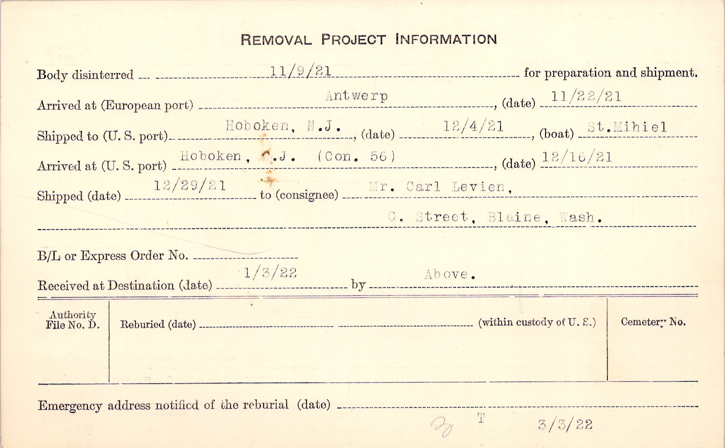 Body disinterred 11/9/1921 for preparation and shipment.