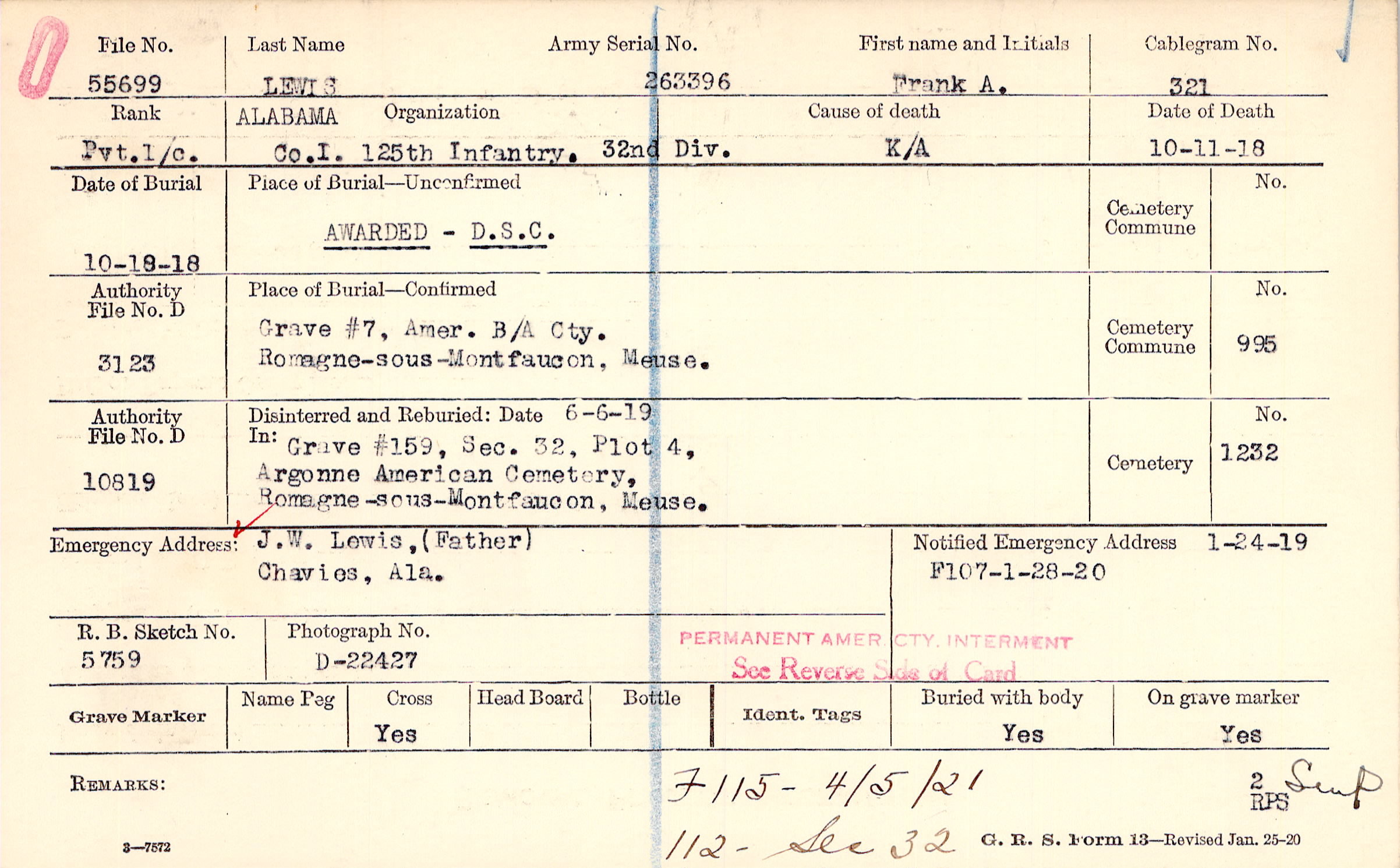 Grave 159, Section 32, Plot 4, Argonne American Cemetery, Romagne-sous-Montfaucon, Meuse