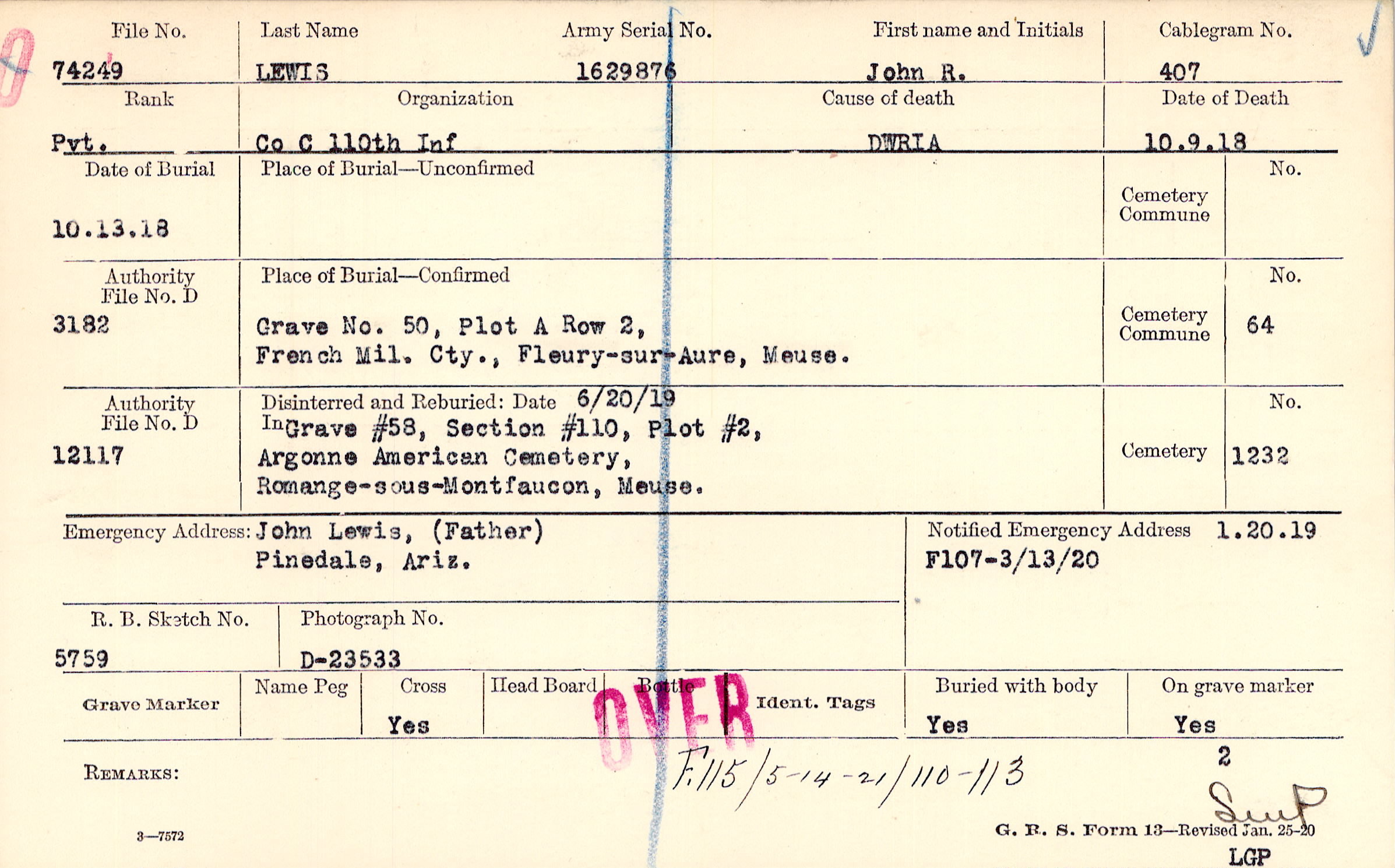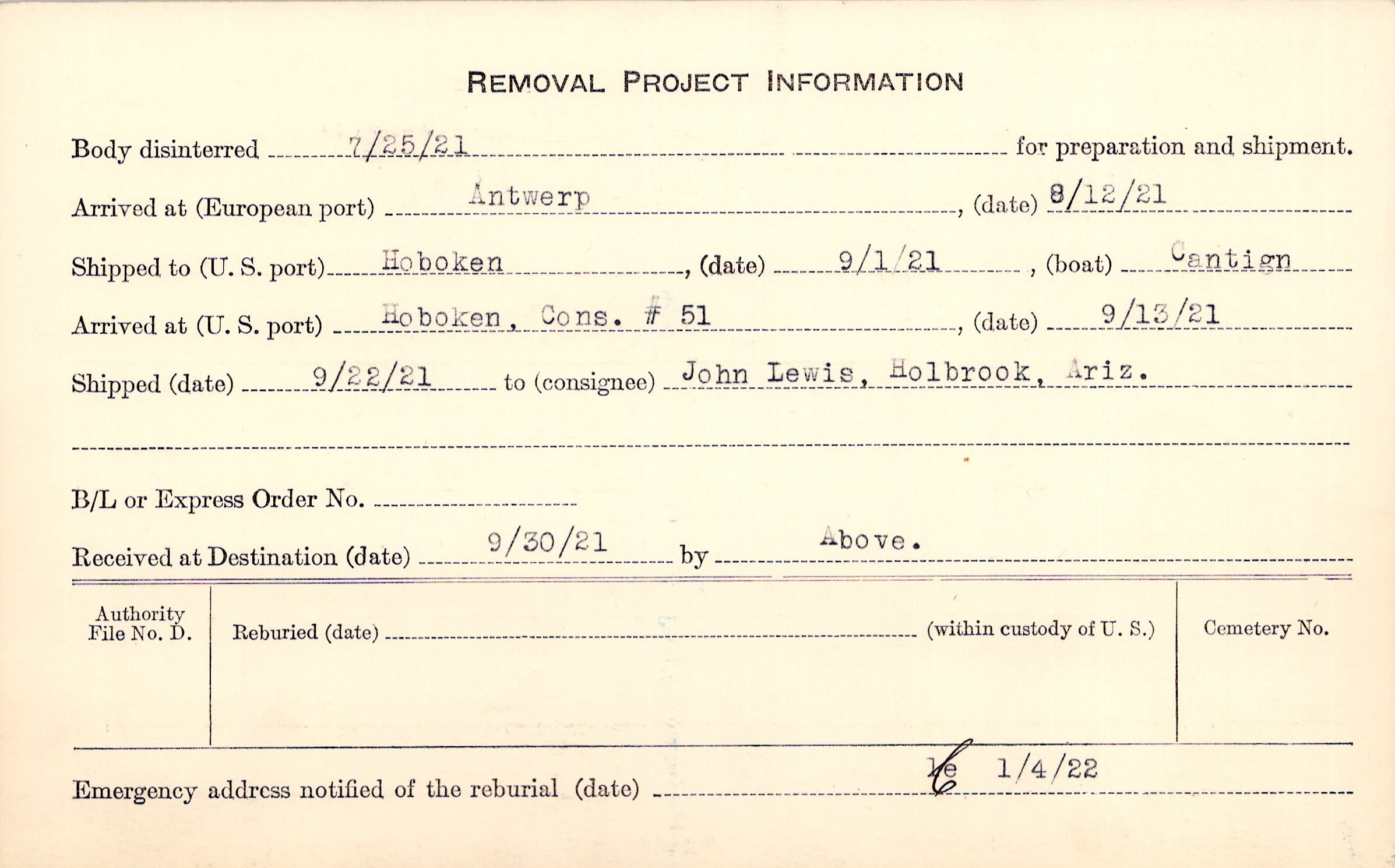 Body disinterred 7/25/1921 for preparation and shipment.