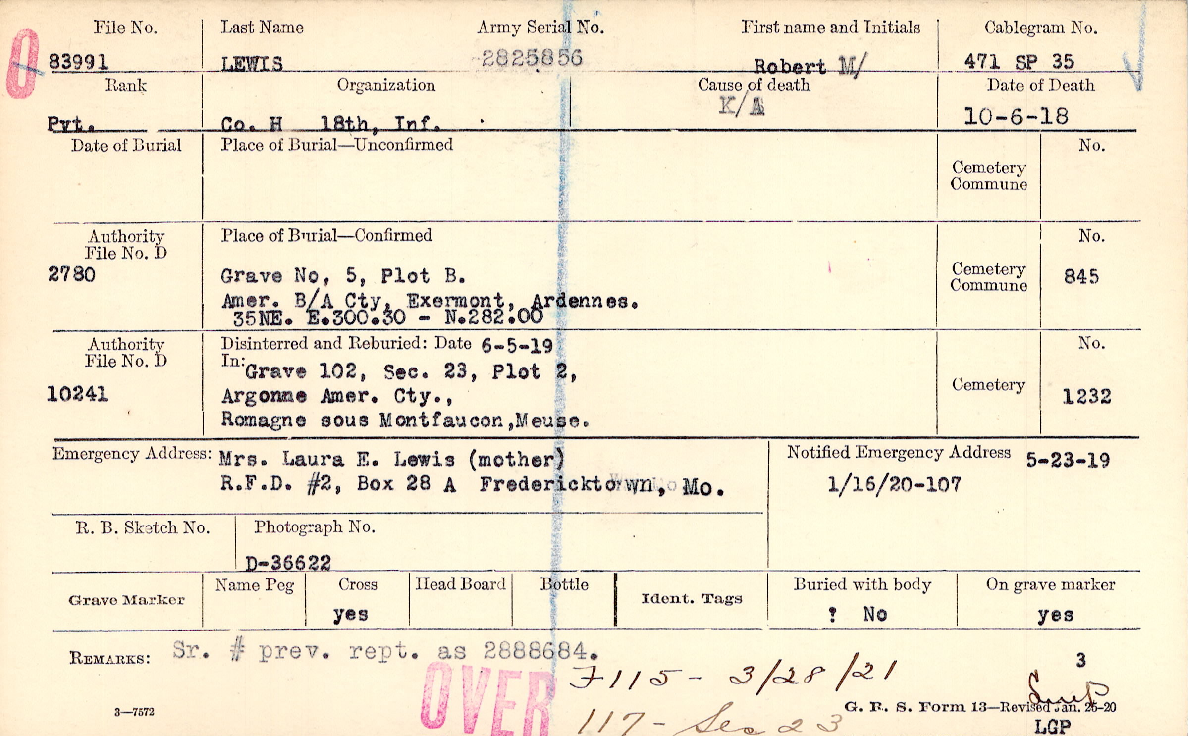 Mrs. Laura E. Lewis (mother), R.F.D. #2, Box 28 A Fredericktown, Mo.