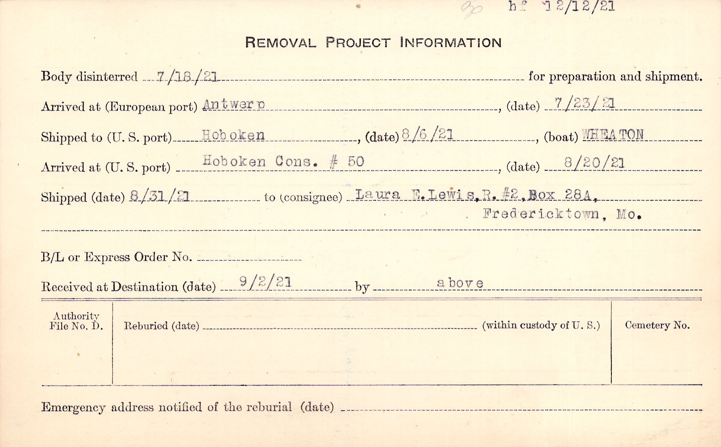 Body disinterred 7/18/1921 for preparation and shipment.