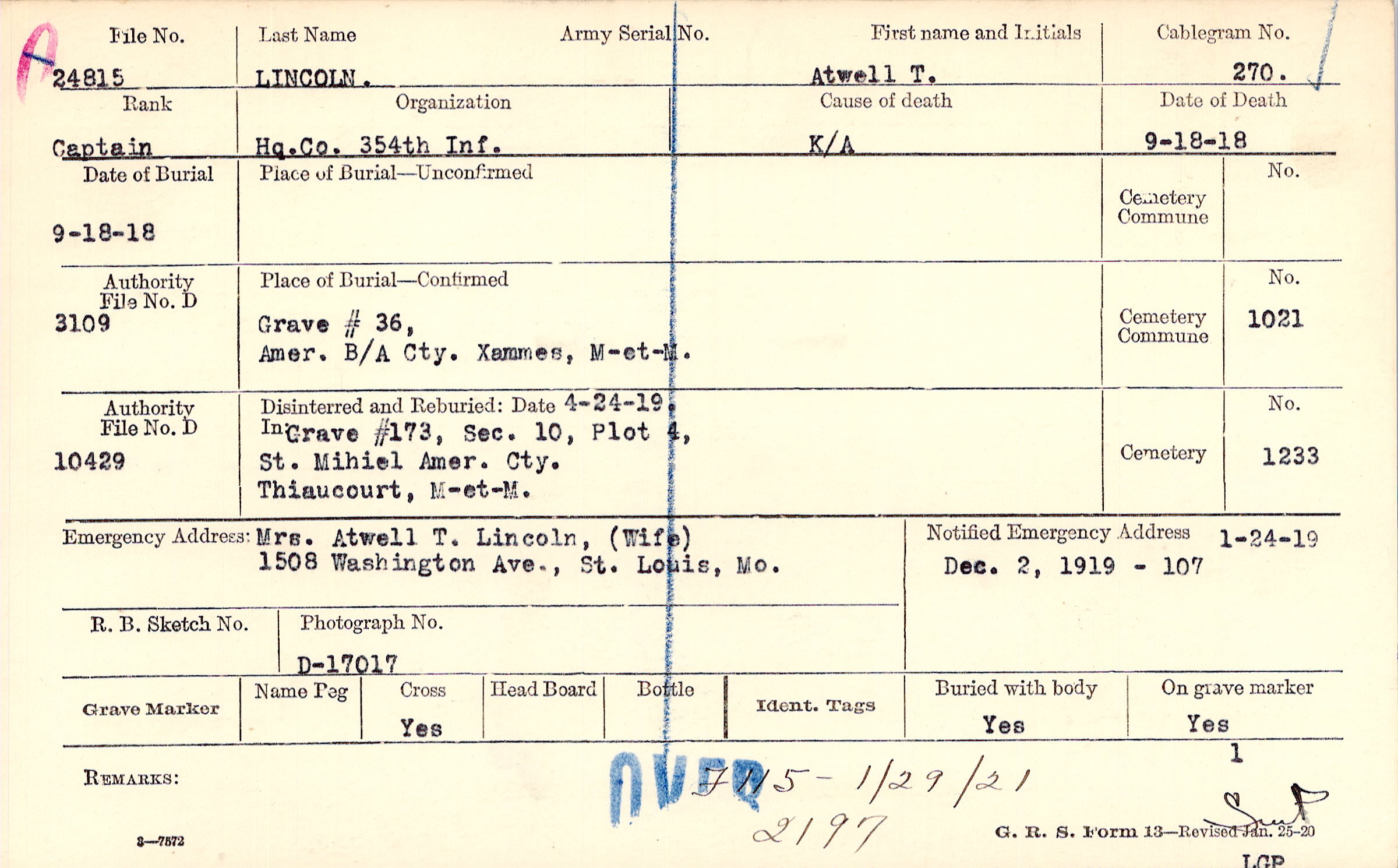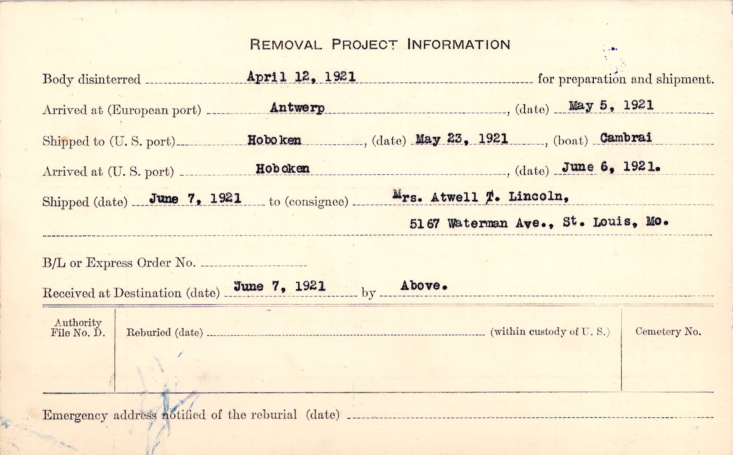 Mrs. Atwell T. Lincoln, (Wife), 1508 Washington Ave., St. Louis, Mo.