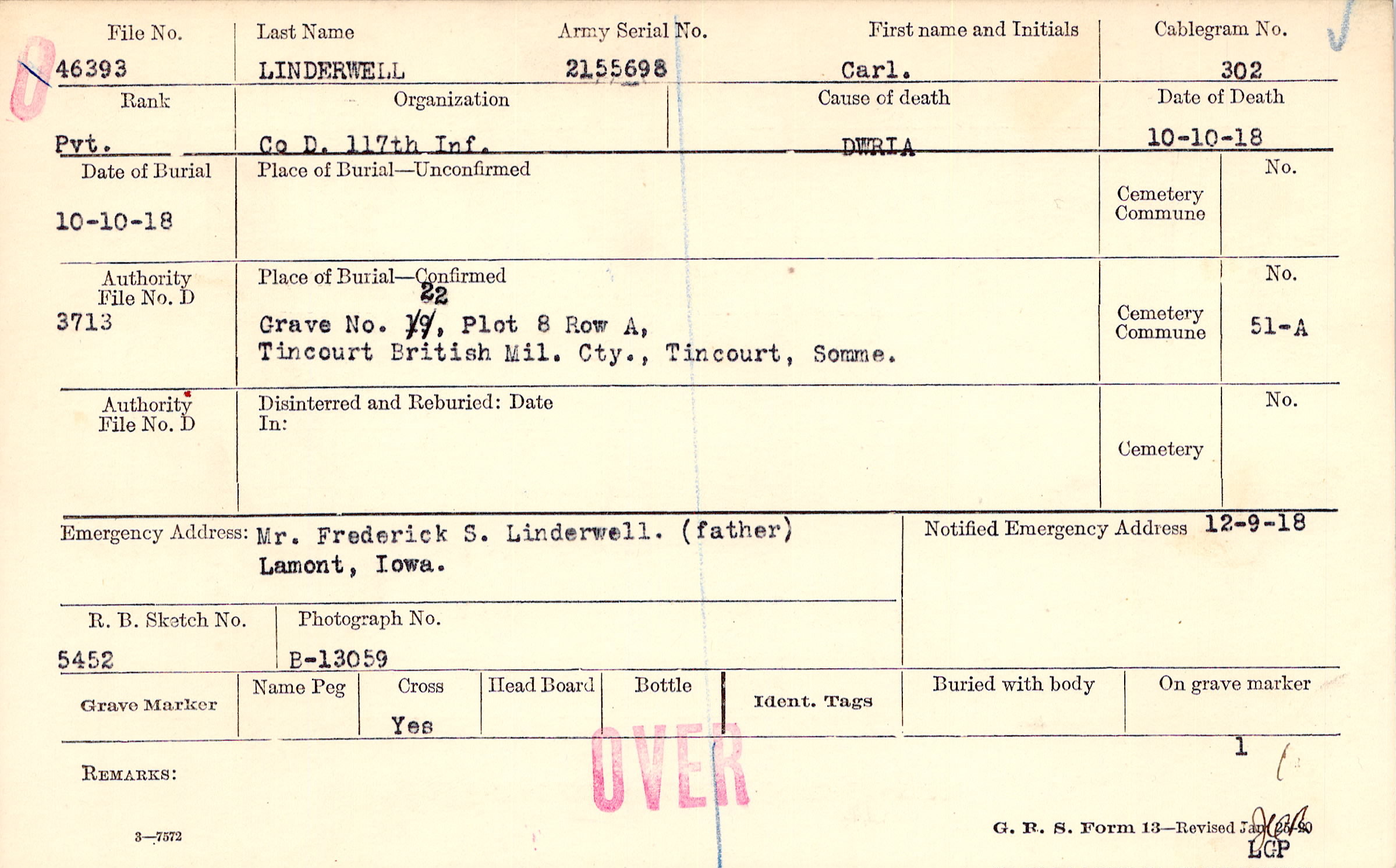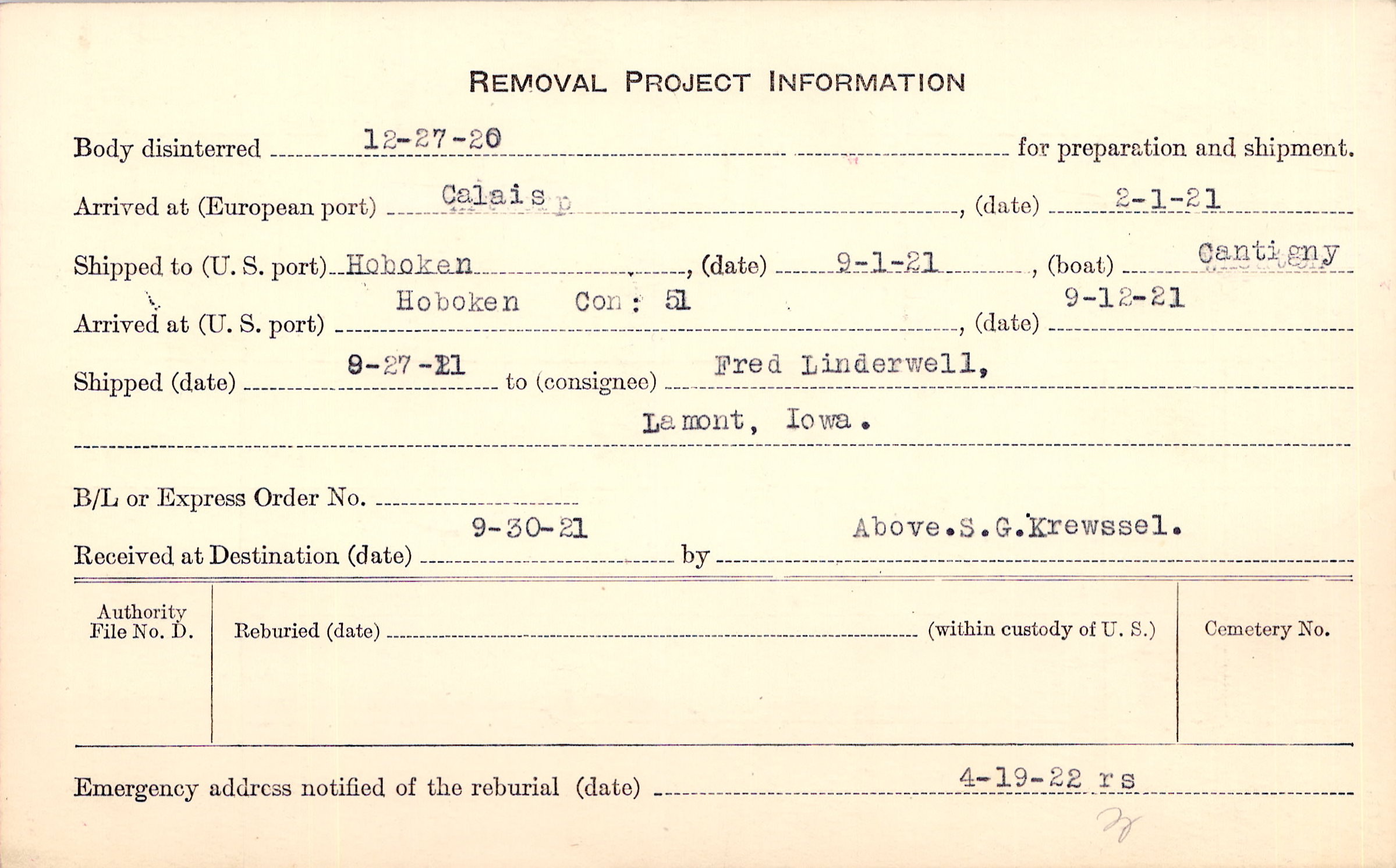 Mr. Frederick S. Linderwell. (father), Lamont, Iowa.