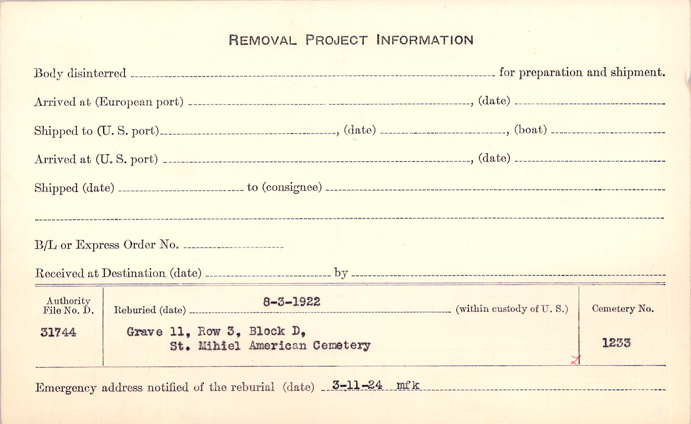 | Permanent Burial in Foreign Cemetery |