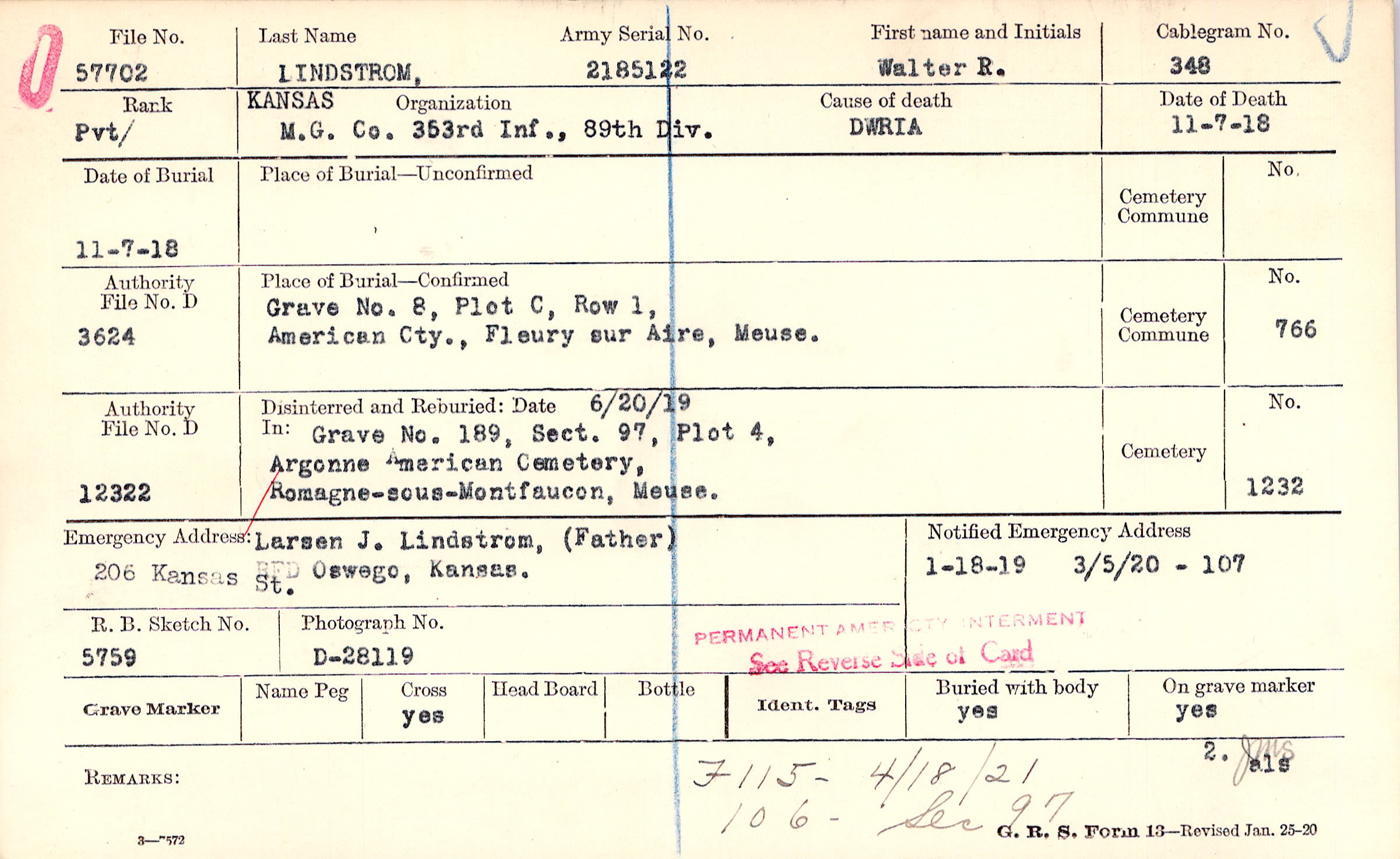 Larsen J. Lindstrom, (Father), 206 Kansas St. Oswego, Kansas., Permanent Amer. Cty. Interment See Reverse Side of Card