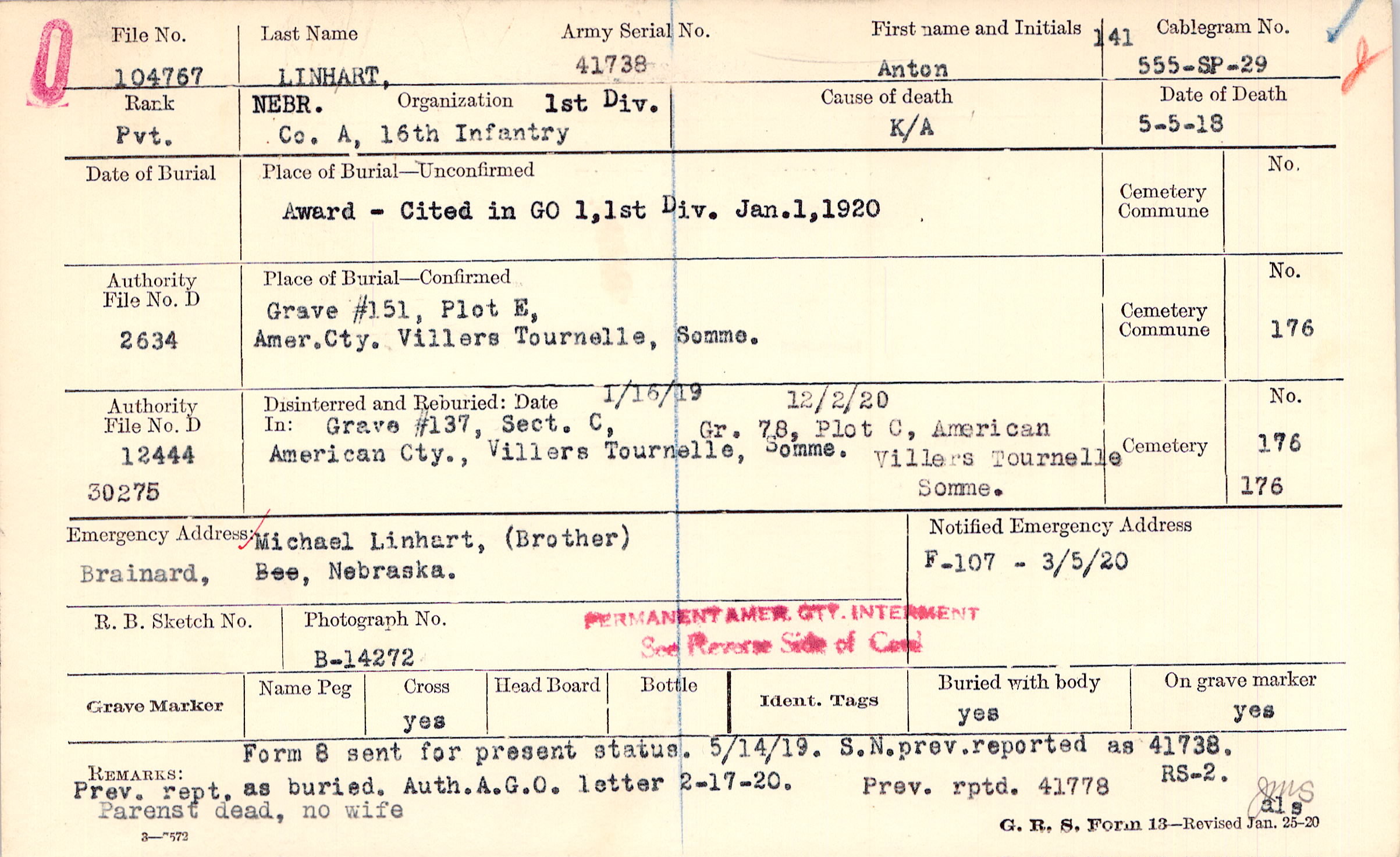 S.N. prev. reported as 41738. Prev. rept. as buried, Auth. A.G.O. letter 2-17-20. Prev. rptd. 41778 Parents dead, no wife, Form 8 sent for present status. 5/14/19.