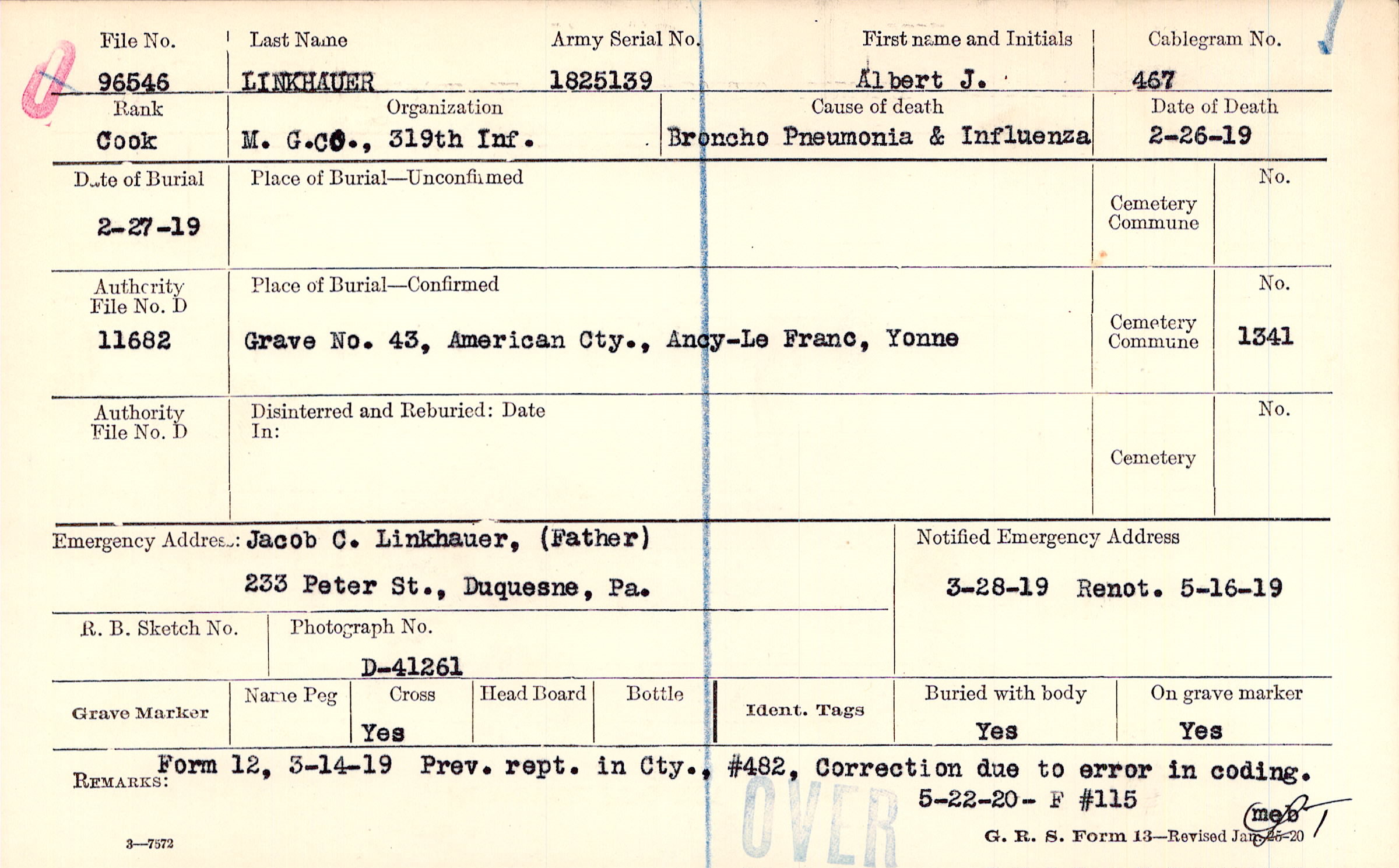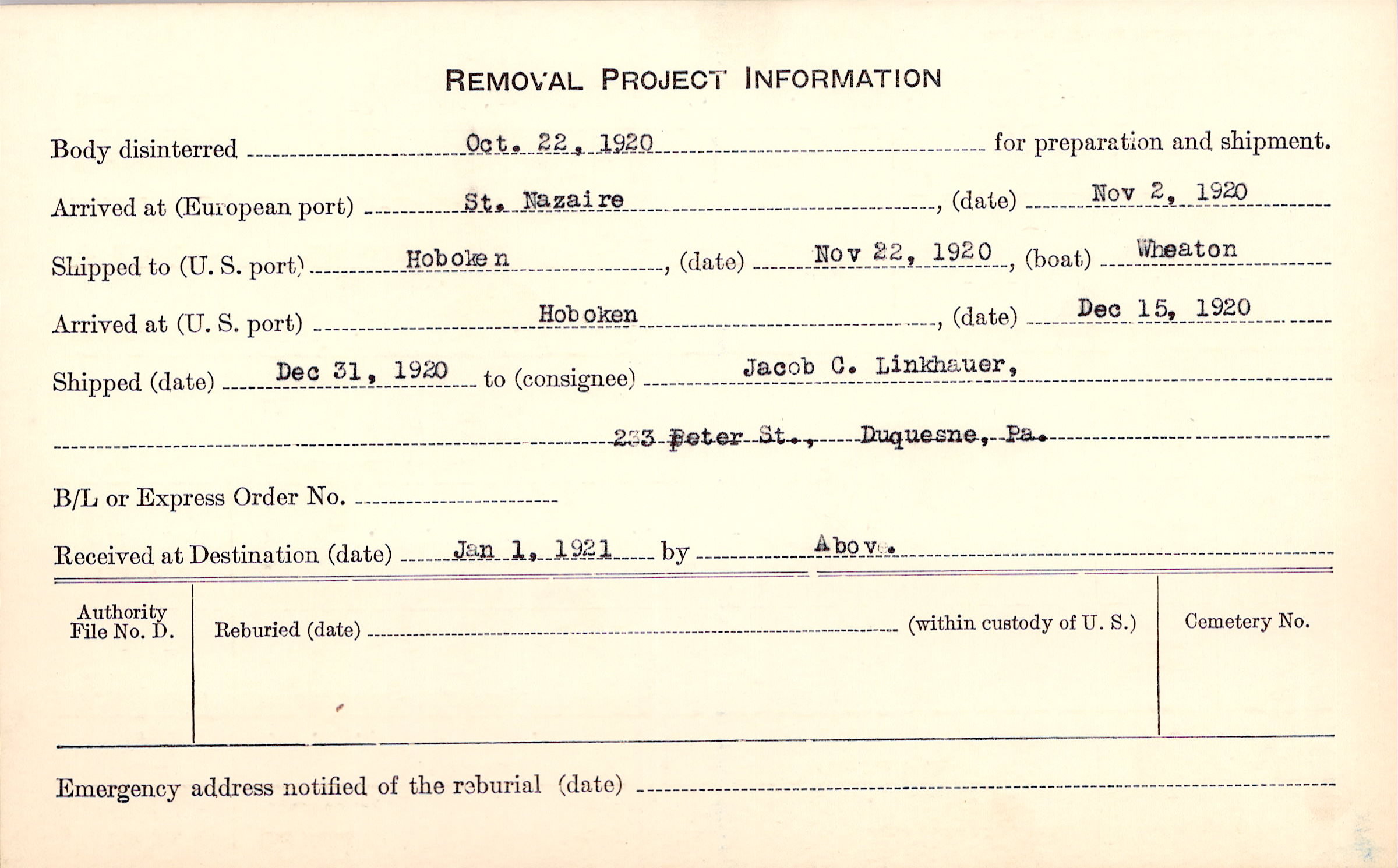Jacob C. Linkhauer, (Father), 233 Peter St., Duquesne, Pa.
