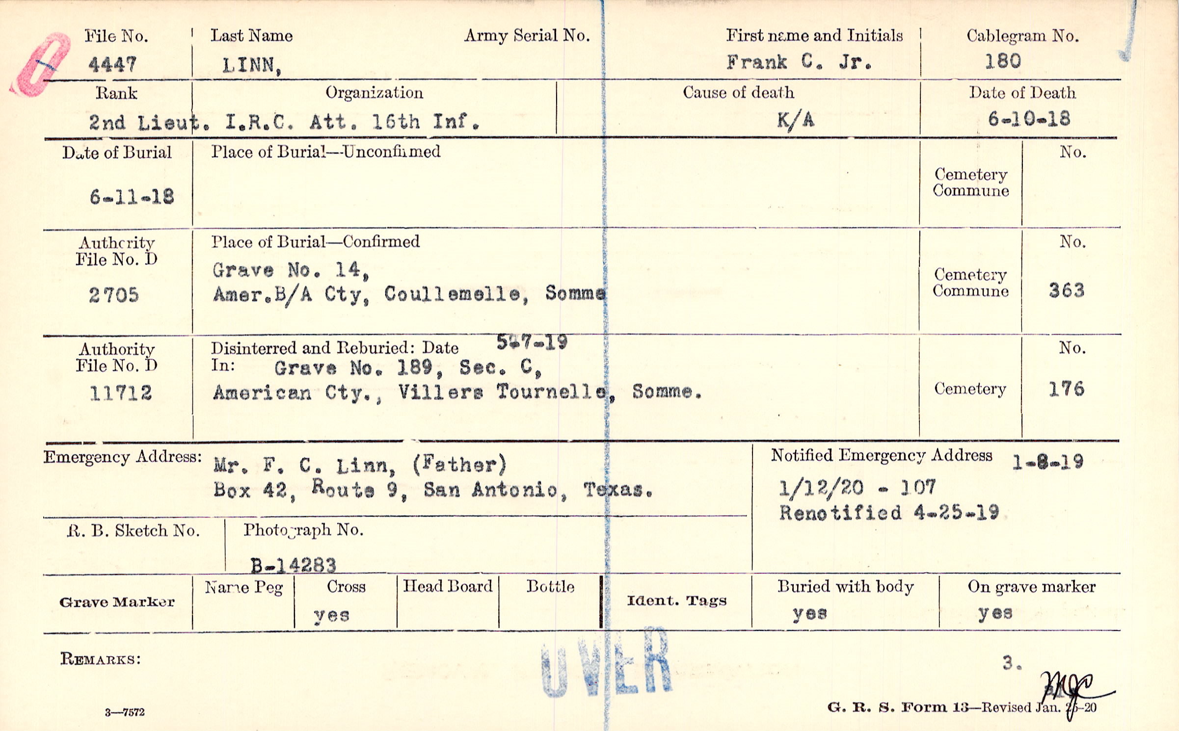 Mr. F. C. Linn, (Father), Box 42, Route 9, San Antonio, Texas.