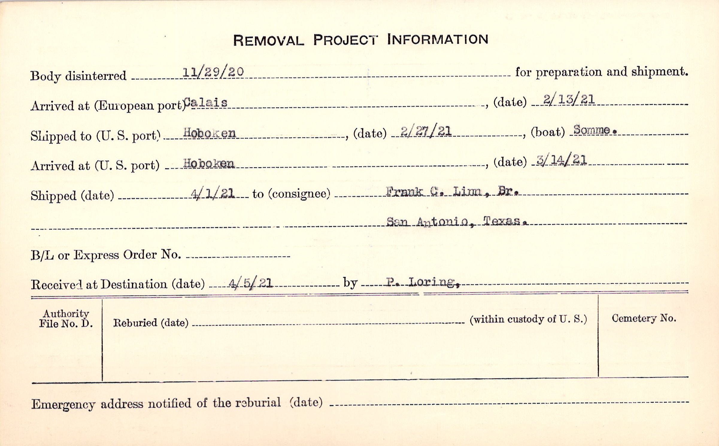 Body disinterred 11/29/1920 for preparation and shipment.