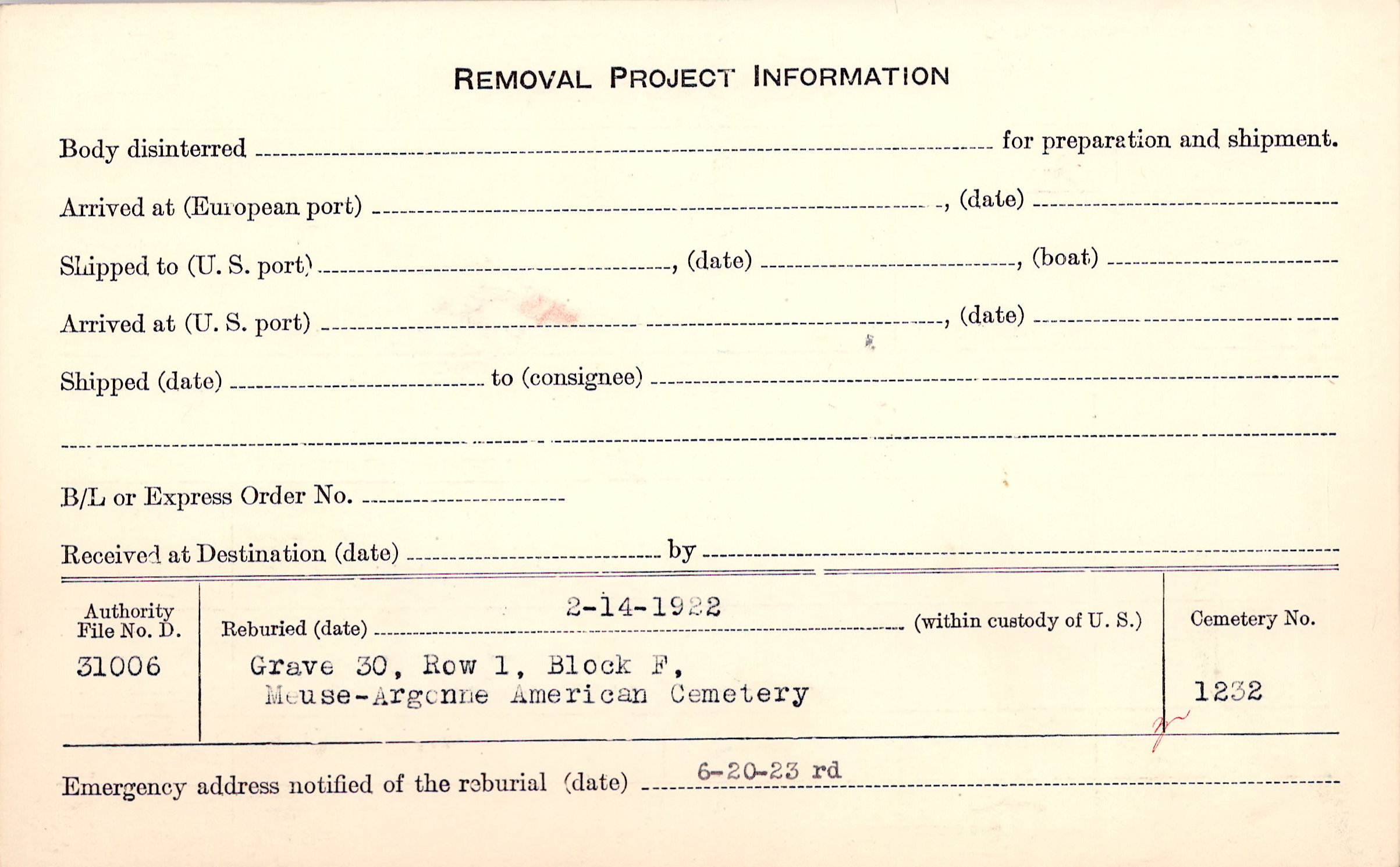 | Permanent Burial in Foreign Cemetery |