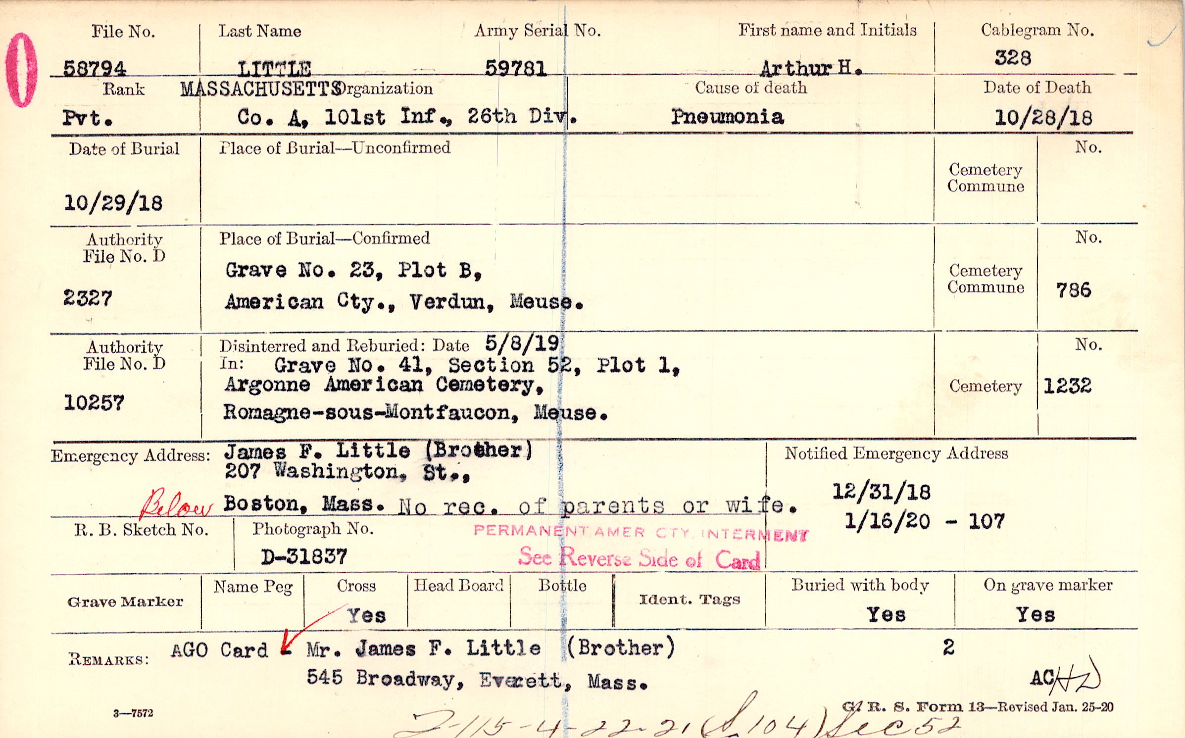 AGO Card - Mr. James F. Little (Brother) 545 Broadway, Everett, Mass., F-115-4-22-21 (S-104) Sec 52