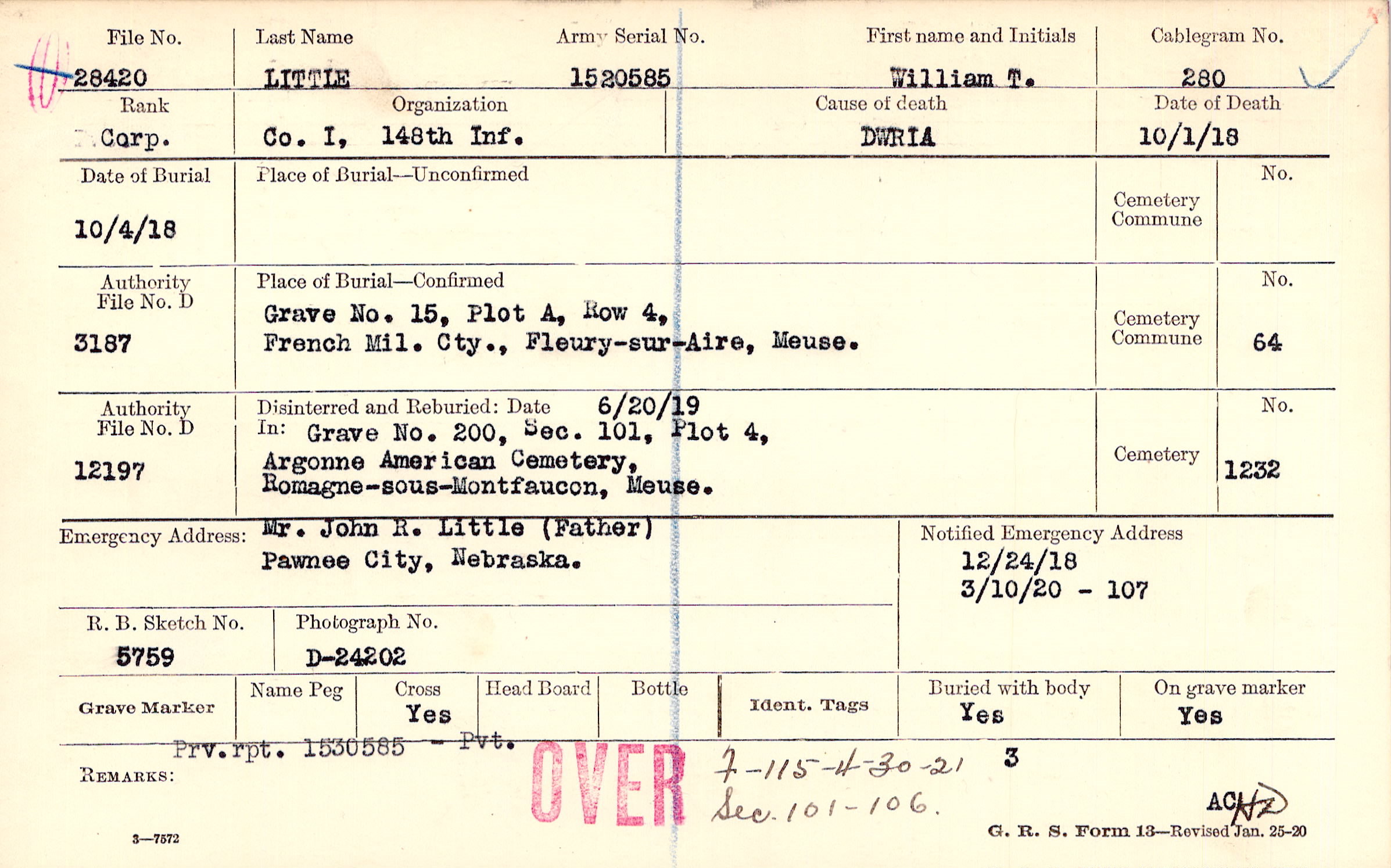 Grave 200, Section 101, Plot 4, Argonne American Cemetery, Romagne-sous-Montfaucon, Meuse