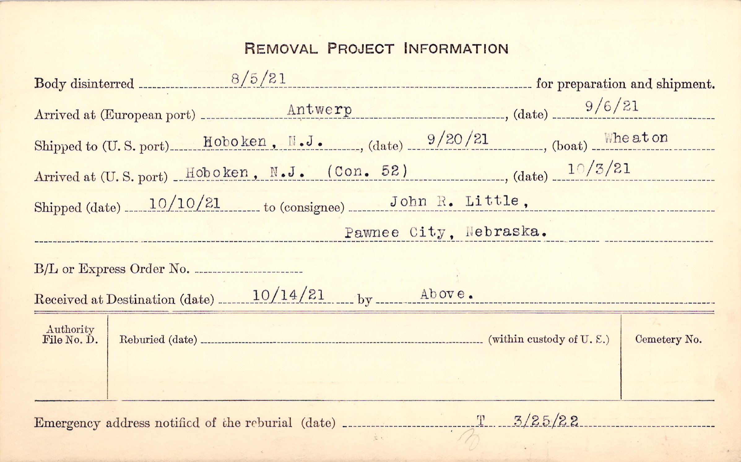 Body disinterred 8/5/1921 for preparation and shipment.