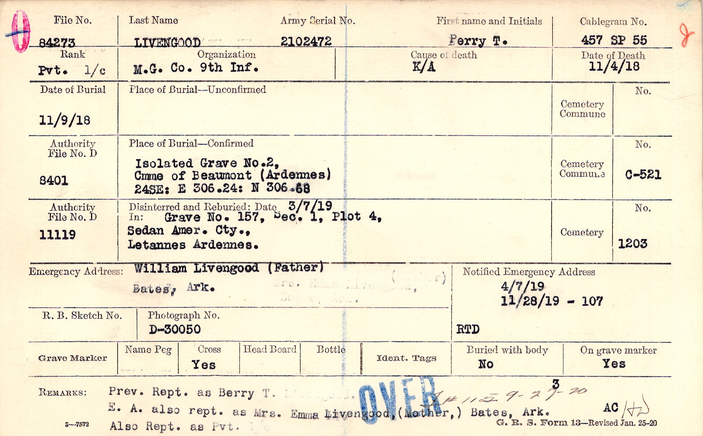 Grave 157, Section 1, Plot 4, Sedan American Cemetery, Latanne, Ardennes