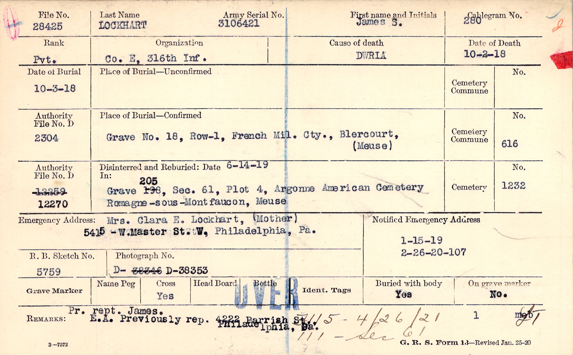 Mrs. Clara E. Lockhart, (Mother), 5415 W. Master St. W, Philadelphia, Pa.