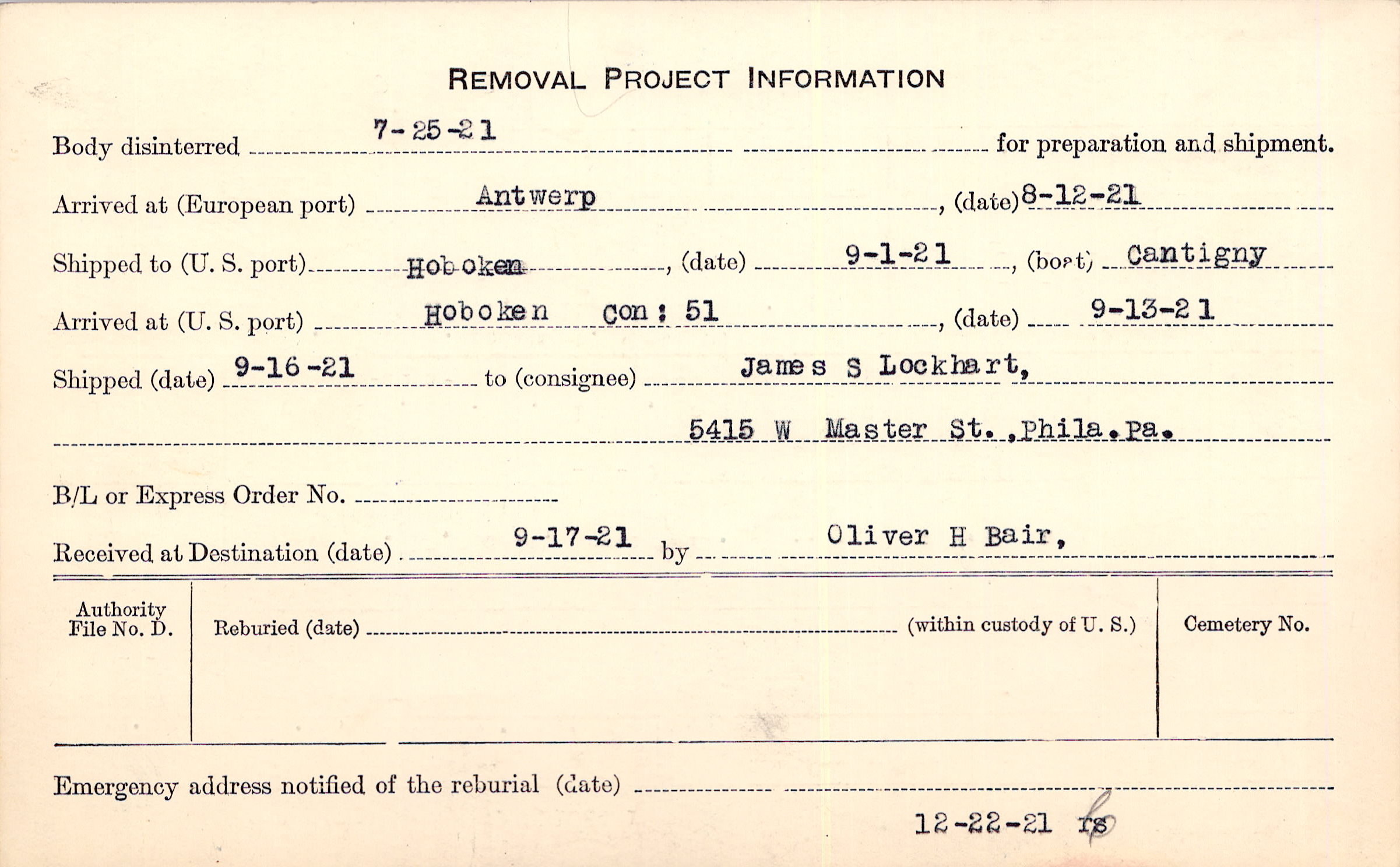 Body disinterred 7/25/1921 for preparation and shipment.