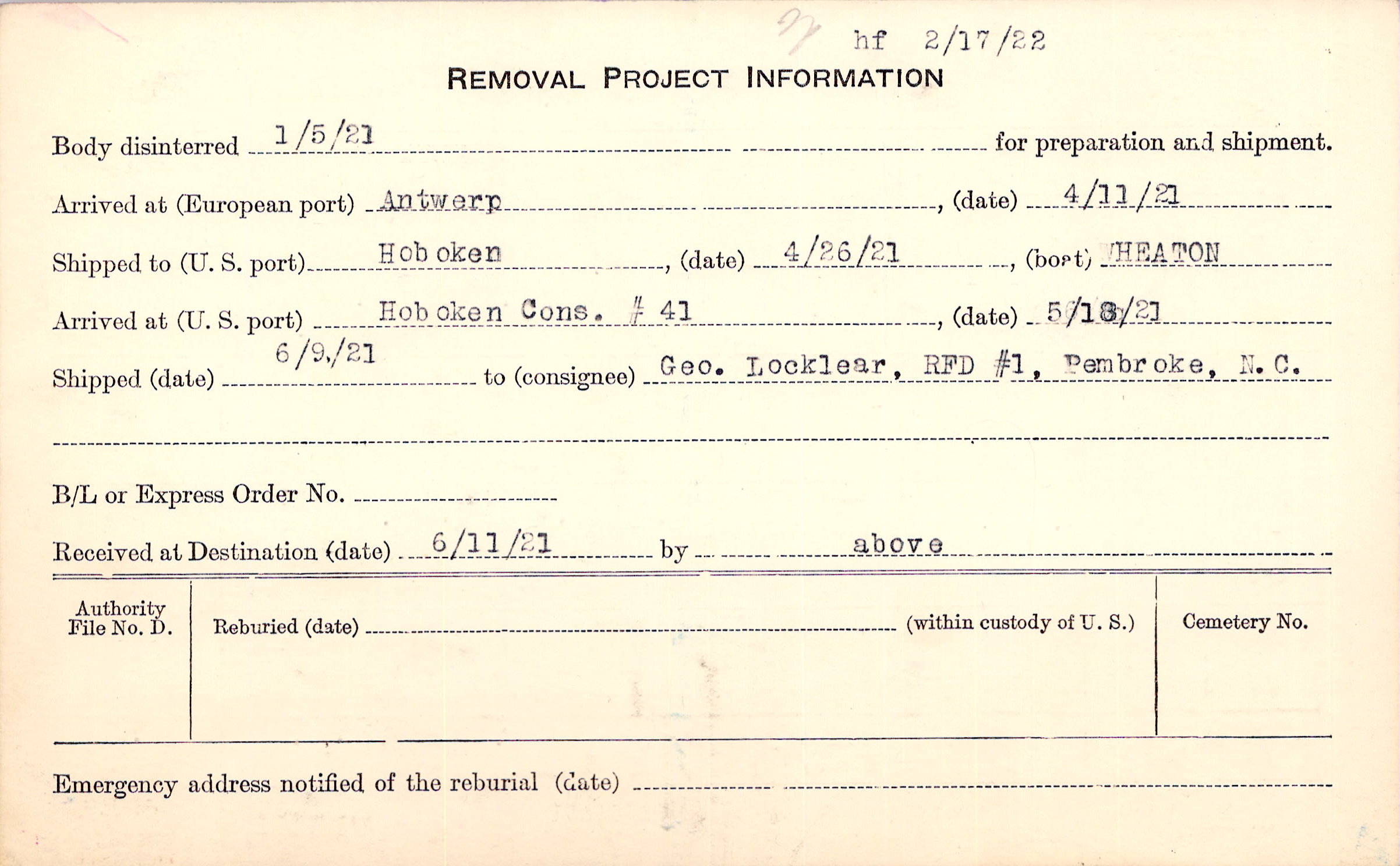 Mr. George Locklear (Father), RFD #1, Pembroke, N.C.