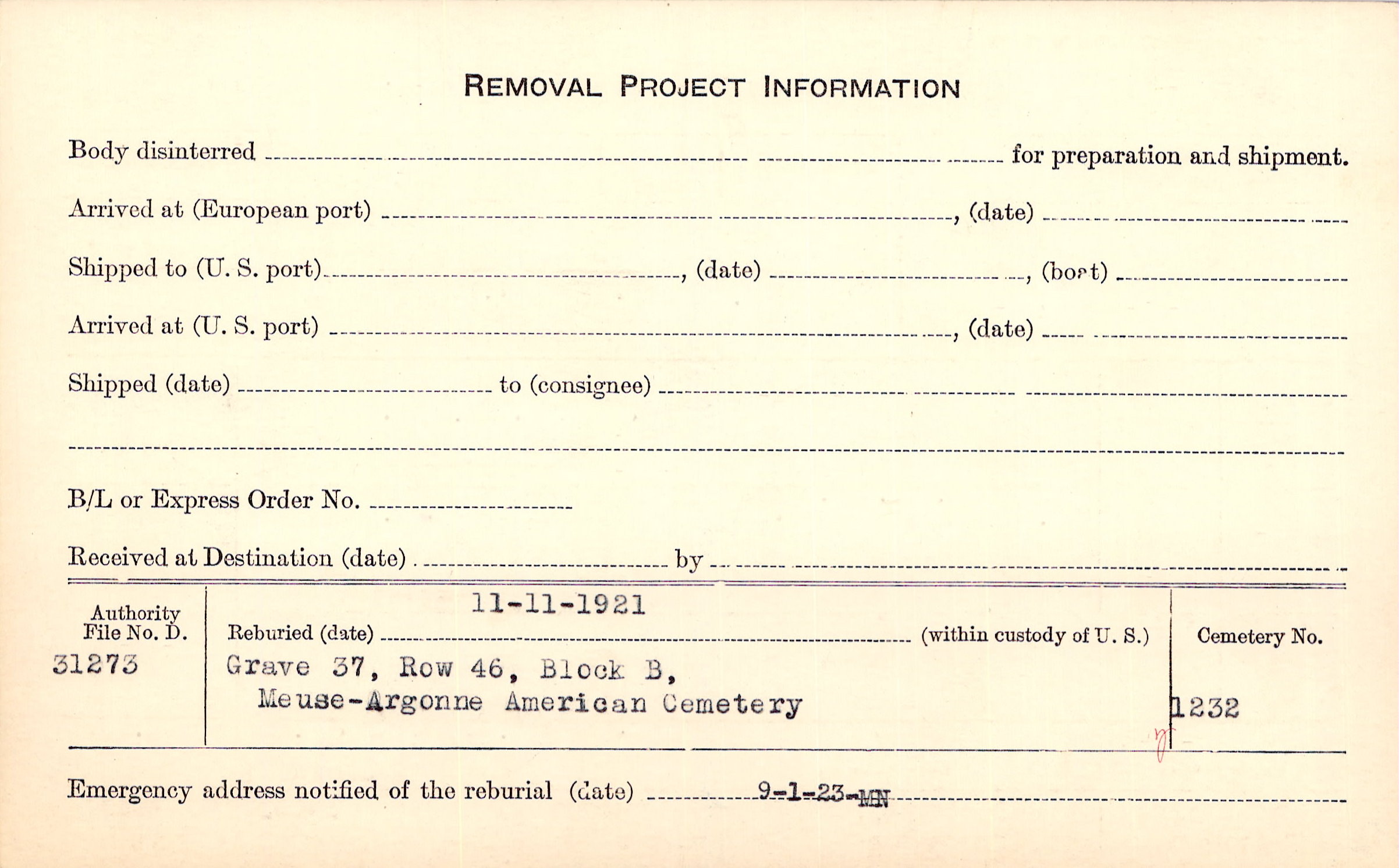 | Permanent Burial in Foreign Cemetery |