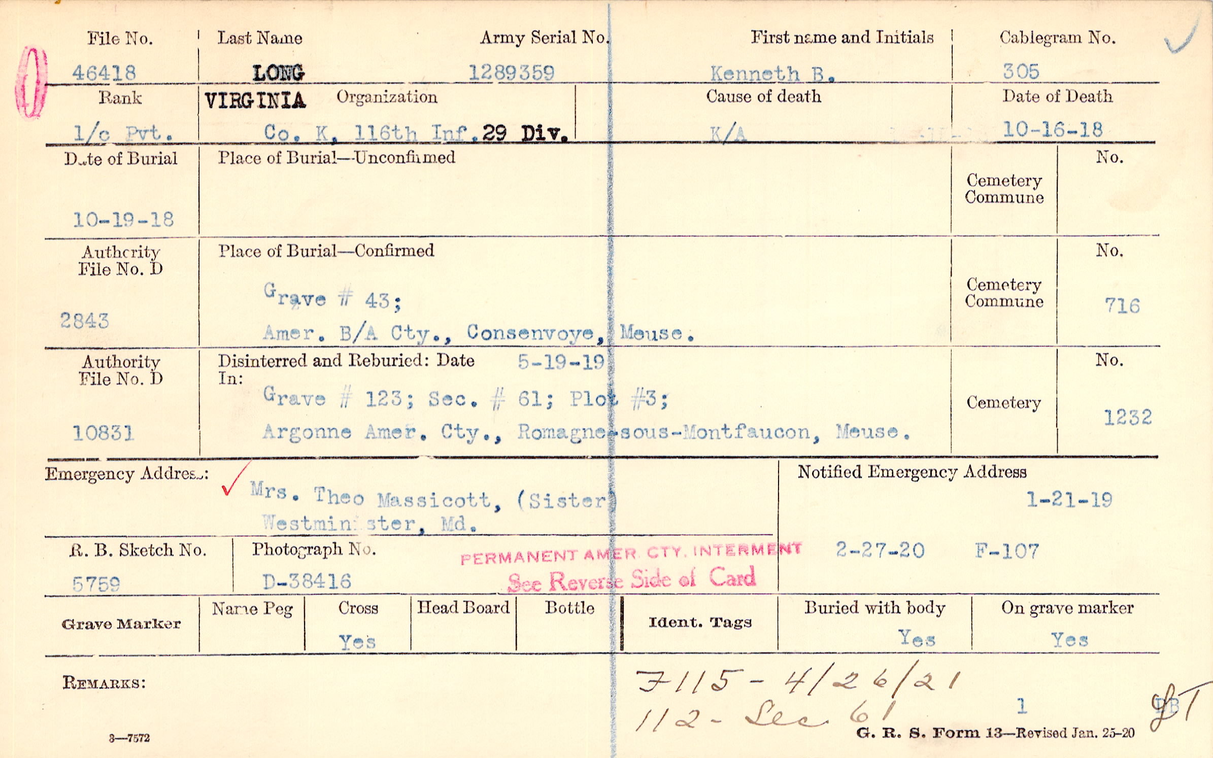 Grave #43,Amer. B/A Cty.,Consenvoye, Meuse.