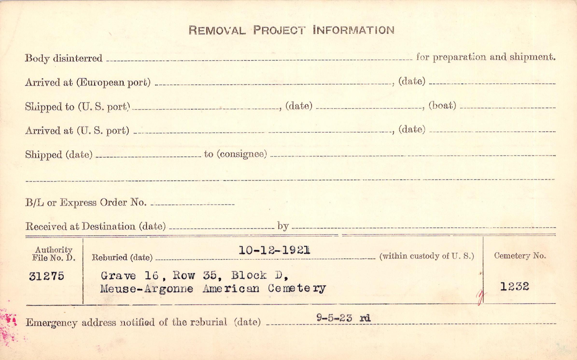 Grave 123, Section 61, Plot 3, Argonne American Cemetery, Romagne-sous-Montfaucon, Meuse