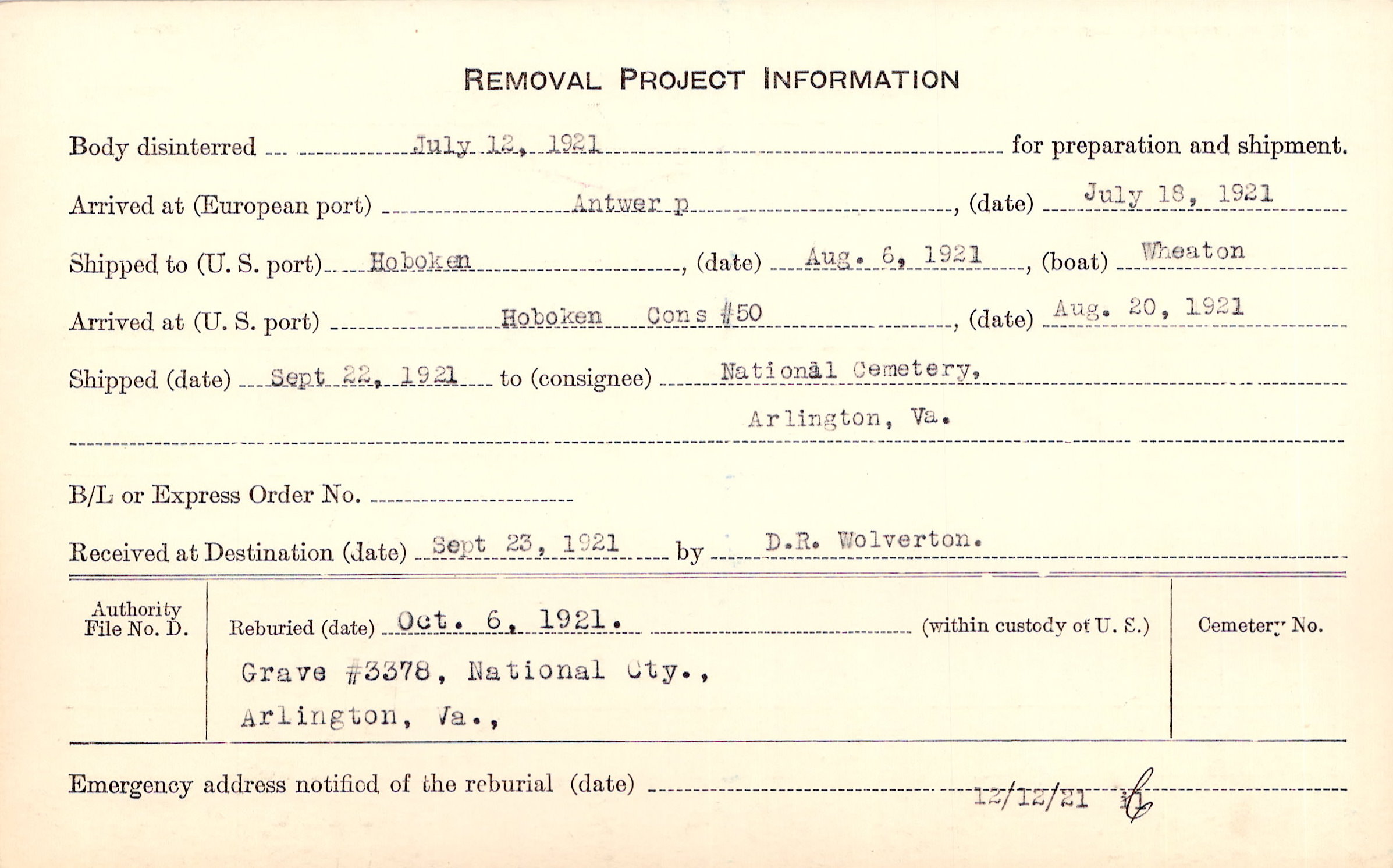 Body disinterred 7/12/1921 for preparation and shipment.