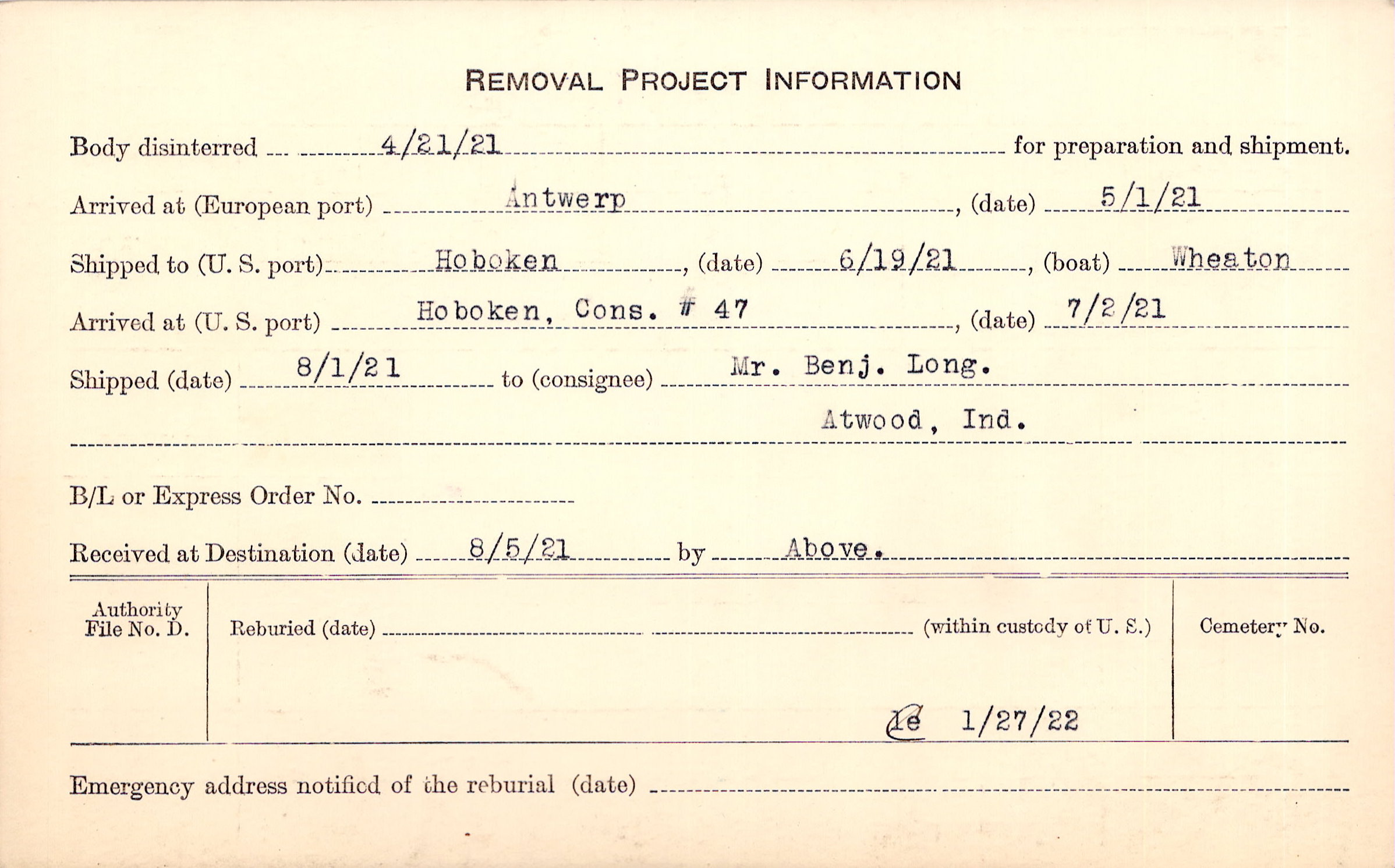 Body disinterred 4/21/1921 for preparation and shipment.