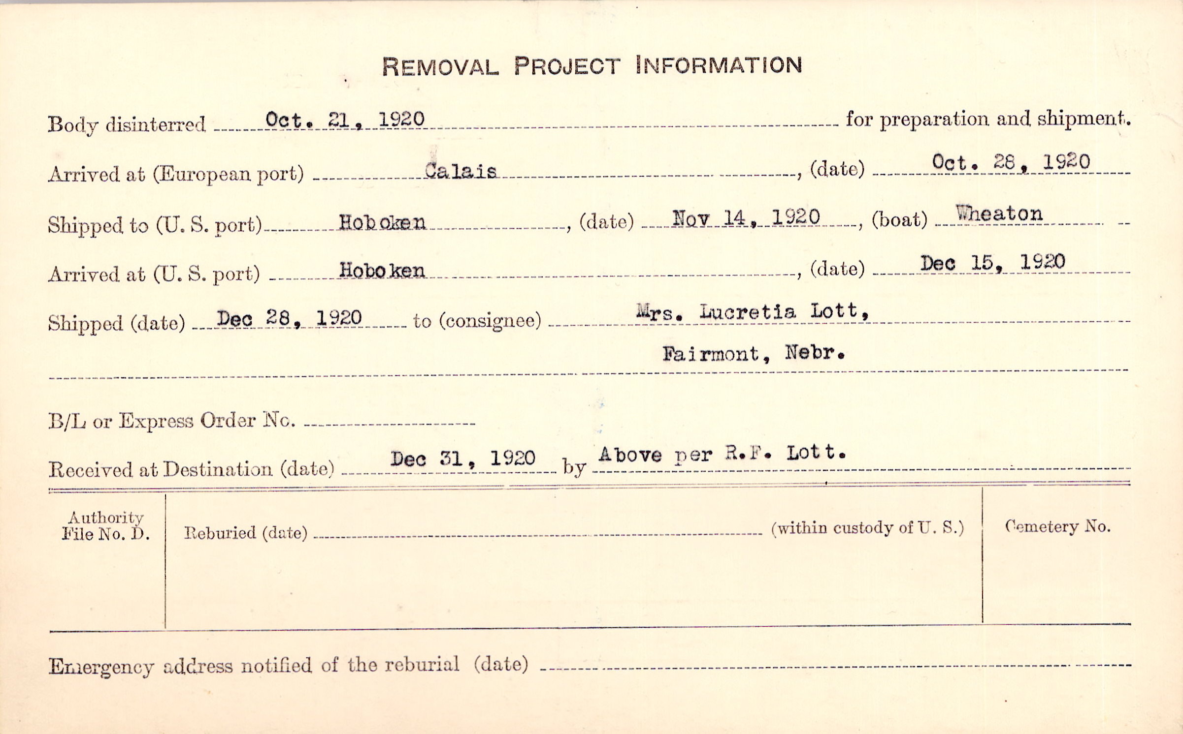 Body disinterred 10/21/1920 for preparation and shipment.