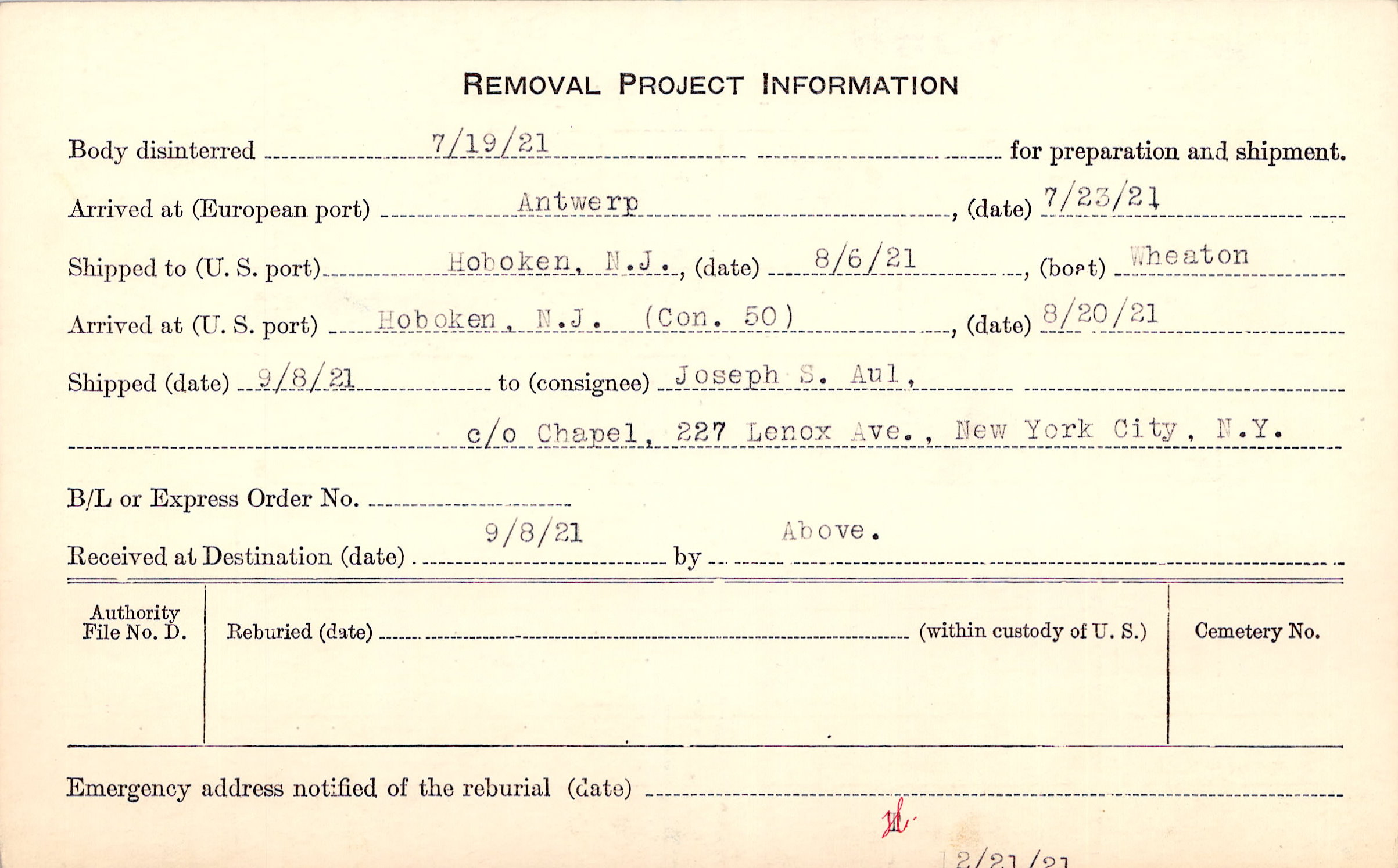 Body disinterred 7/19/1921 for preparation and shipment.